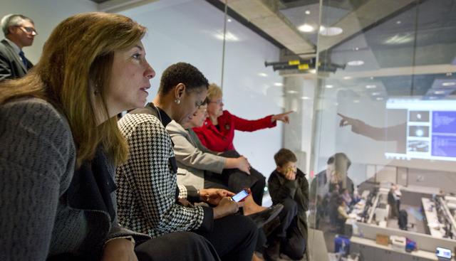 NASA Deputy Administrator Lori Garver, left, watches the launch of the National Polar-orbiting Operational Environmental Satellite System Preparatory Project (NPP) at the National Oceanic and Atmospheric Administration (NOAA) Satellite Operations Center on Friday, Oct. 28, 2011 in Suitland, Md. U.S Congresswoman Donna Edwards, D-Md., is seen next to Garver. NPP is a joint venture between NASA and NOAA, and is the nation's newest Earth-observing satellite, which will provide data on climate change science, allow for accurate weather forecasts and advance warning for severe weather. NPP was launched from Vandenberg Air Force Base in California. Photo Credit: (NASA/Carla Cioffi)