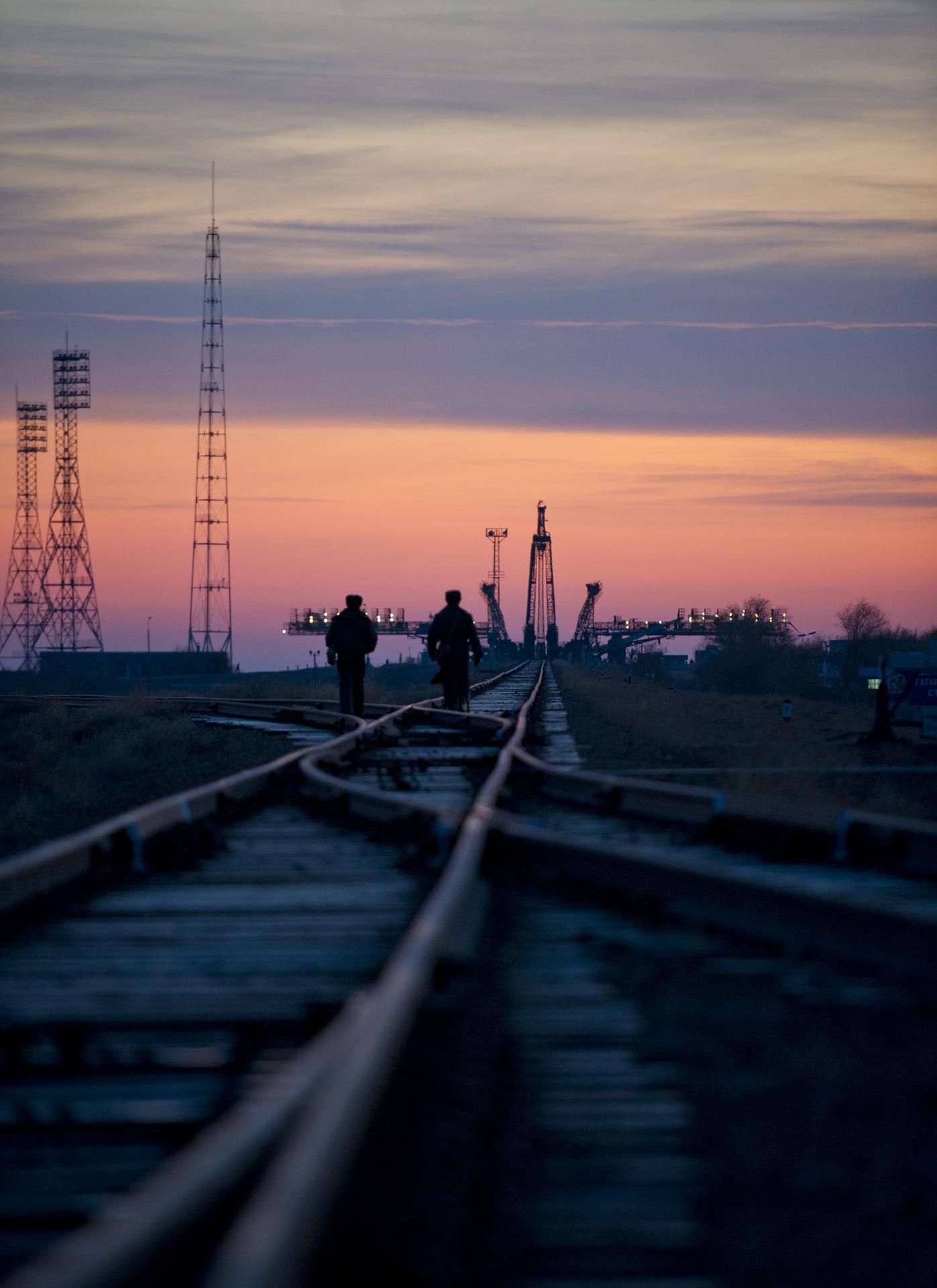 Russian security officers walk along the railroad tracks out to the launch pad Monday, Nov. 11, 2011 at the Baikonur Cosmodrome in Kazakhstan. The Soyuz TMA-22 is scheduled to launch the crew of Expedition 29 on November 14. Photo Credit: (NASA/Carla Cioffi)