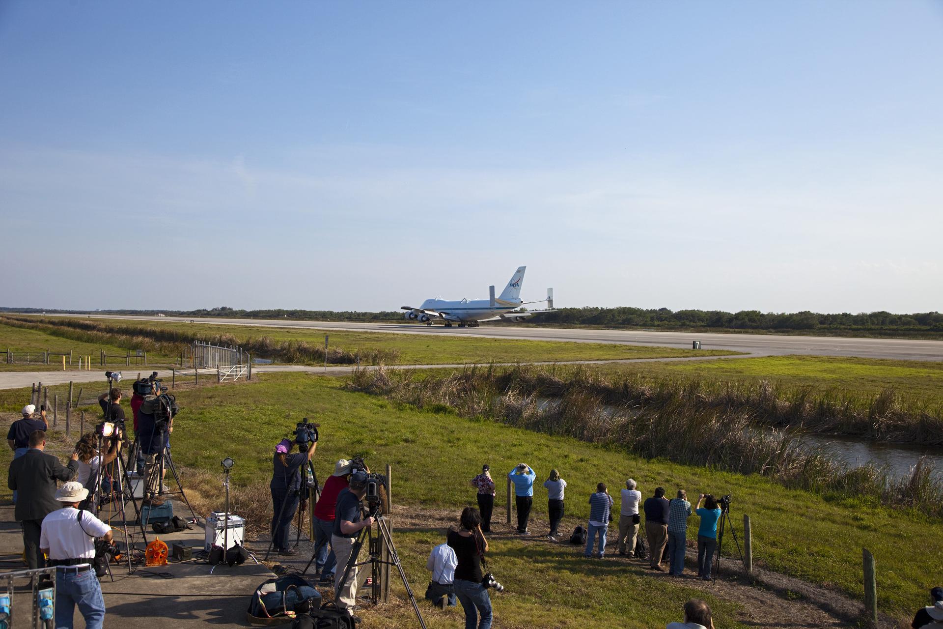 CAPE CANAVERAL, Fla. – Media representatives are on hand at the Shuttle Landing Facility at NASA’s Kennedy Space Center in Florida for the arrival of the Shuttle Carrier Aircraft. The aircraft, known as an SCA, arrived at 5:35 p.m. EDT to prepare for shuttle Discovery’s ferry flight to the Washington Dulles International Airport in Sterling, Va., on April 17. This SCA, designated NASA 905, is a modified Boeing 747 jet airliner, originally manufactured for commercial use. One of two SCAs employed over the course of the Space Shuttle Program, NASA 905 is assigned to the remaining ferry missions, delivering the shuttles to their permanent public display sites. NASA 911 was decommissioned at the NASA Dryden Flight Research Center in California in February. Discovery will be placed on permanent public display in the Smithsonian's National Air and Space Museum Steven F. Udvar-Hazy Center in Chantilly, Va. For more information on the SCA, visit http:__www.nasa.gov_centers_dryden_news_FactSheets_FS-013-DFRC.html. For more information on shuttle transition and retirement activities, visit http:__www.nasa.gov_shuttle. Photo credit: NASA_Frankie Martin