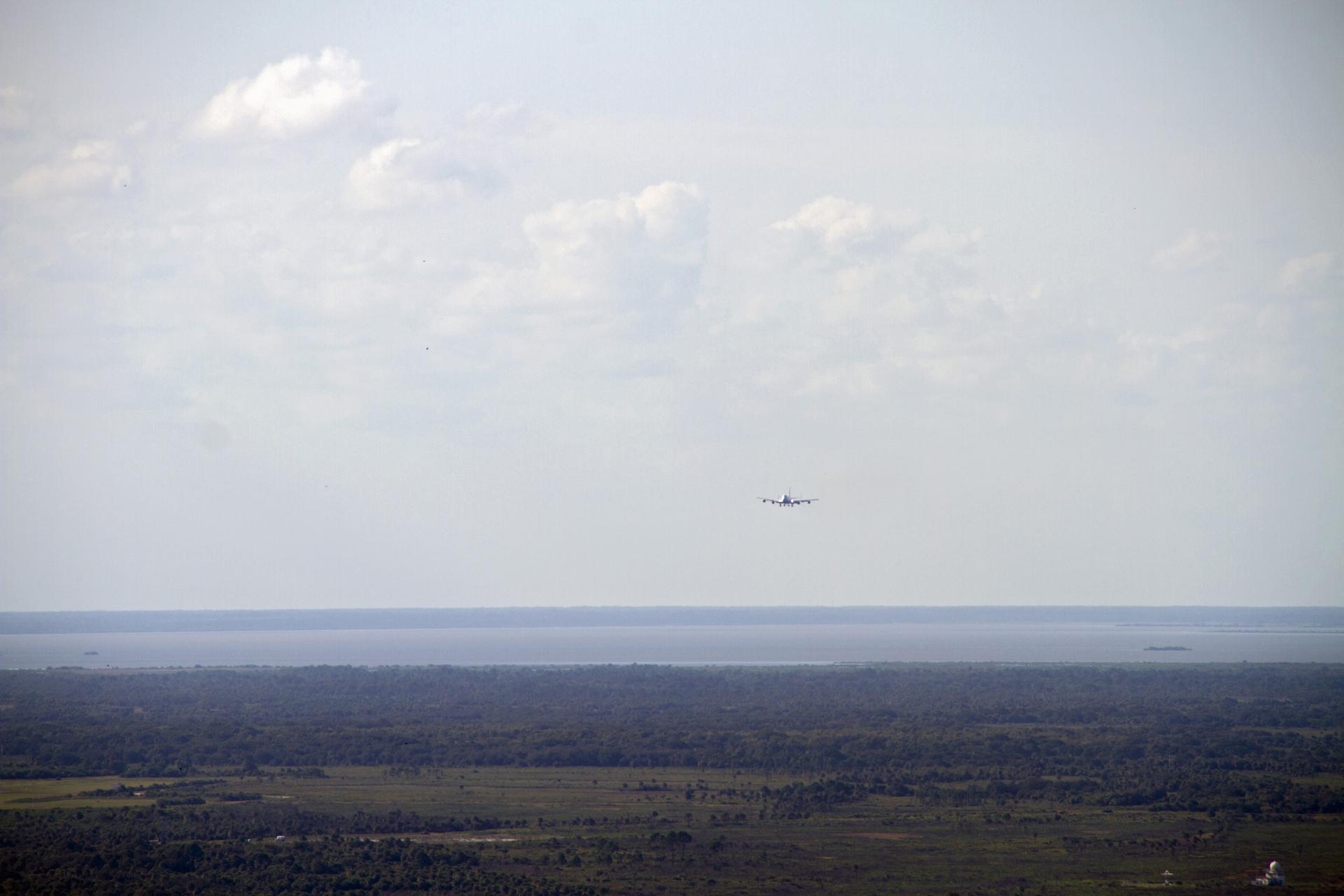 CAPE CANAVERAL, Fla. – The Shuttle Carrier Aircraft, or SCA, approaches the runway at NASA Kennedy Space Center’s Shuttle Landing Facility in Florida. The SCA touched down at 5:05 p.m. EDT to prepare for shuttle Endeavour’s ferry flight to the Los Angeles International Airport on Sept. 17. Photo credit: NASA_Chris Chamberland