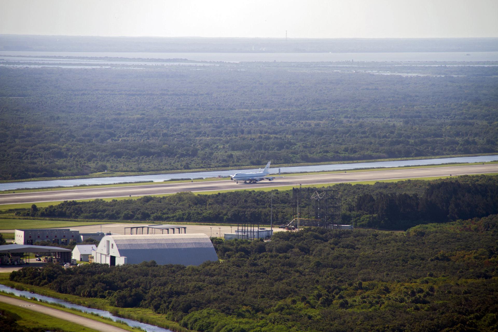 CAPE CANAVERAL, Fla. – The Shuttle Carrier Aircraft, or SCA, rolls down the runway at NASA Kennedy Space Center’s Shuttle Landing Facility in Florida. The SCA touched down at 5:05 p.m. EDT to prepare for shuttle Endeavour’s ferry flight to the Los Angeles International Airport on Sept. 17. Photo credit: NASA_ Chris Chamberland