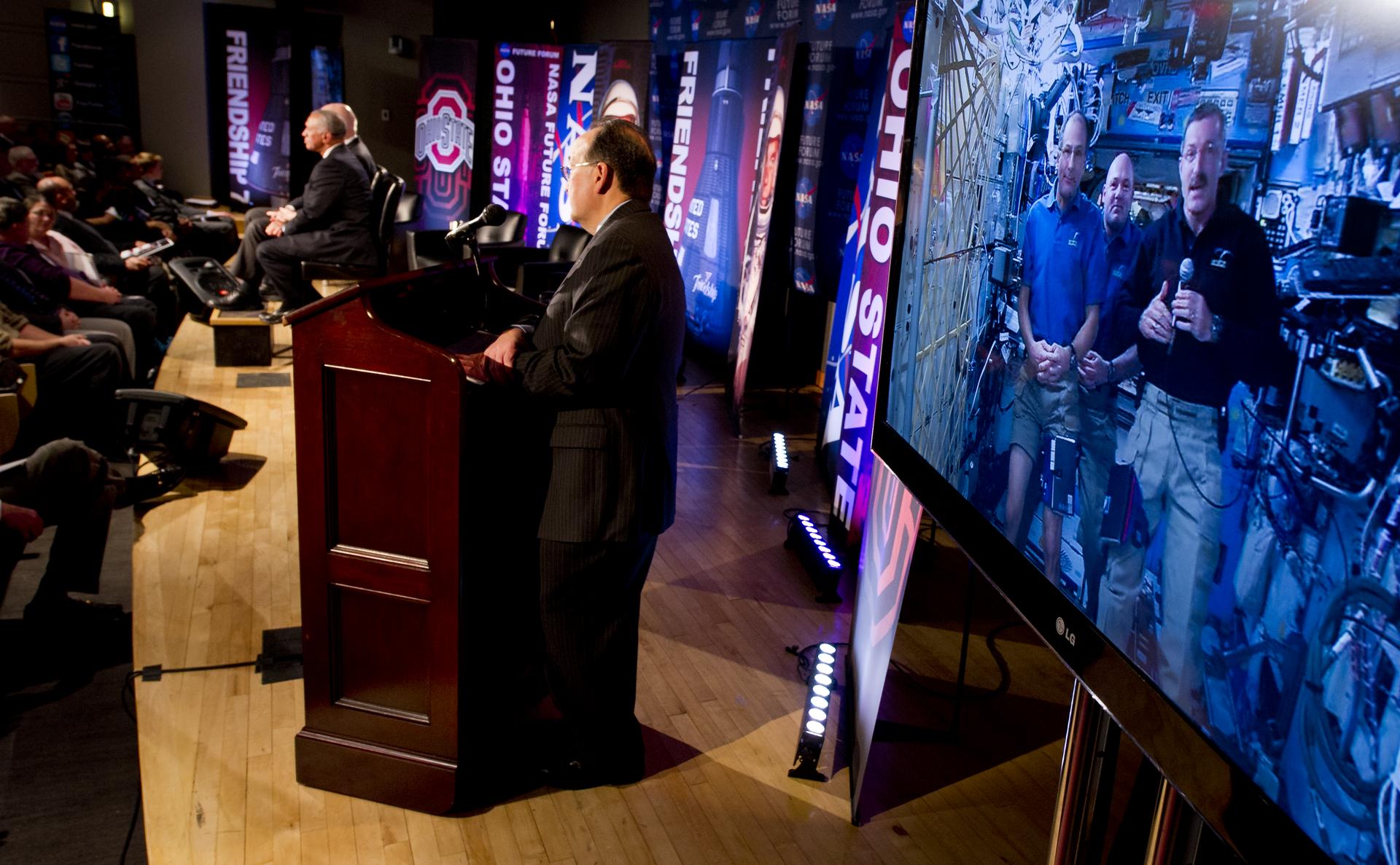 NASA Administrator Charles Bolden surprises Sen. John Glenn, both seated on stage, with a live downlink from International Space Station Expedition 30 crew members Don Pettit, left on screen, Andre Kuipers, and Dan Burbank, right on screen, while Director of the NASA Glenn Research Center Ray Lugo moderates, during NASA's Future Forum at The Ohio State University on Monday, Feb. 20, 2012, in Columbus, Ohio. Monday marked the 50th anniversary of Glenn's historic flight as the first American to orbit Earth. Photo Credit: (NASA/Bill Ingalls)