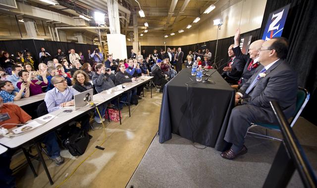 Sen. John Glenn waves to a group of media and Twitter users as he takes the stage with NASA Administrator Charles Bolden and NASA Glenn Research Center Director Ray Lugo, right, at a Tweetup event celebrating John Glenn's legacy and 50 years of americans in orbit held at the Cleveland State University Wolstein Center on Friday, March 3, 2012 in Cleveland, Ohio. Glenn became the first American to orbit Earth in 1962. Photo Credit: (NASA/Bill Ingalls)
