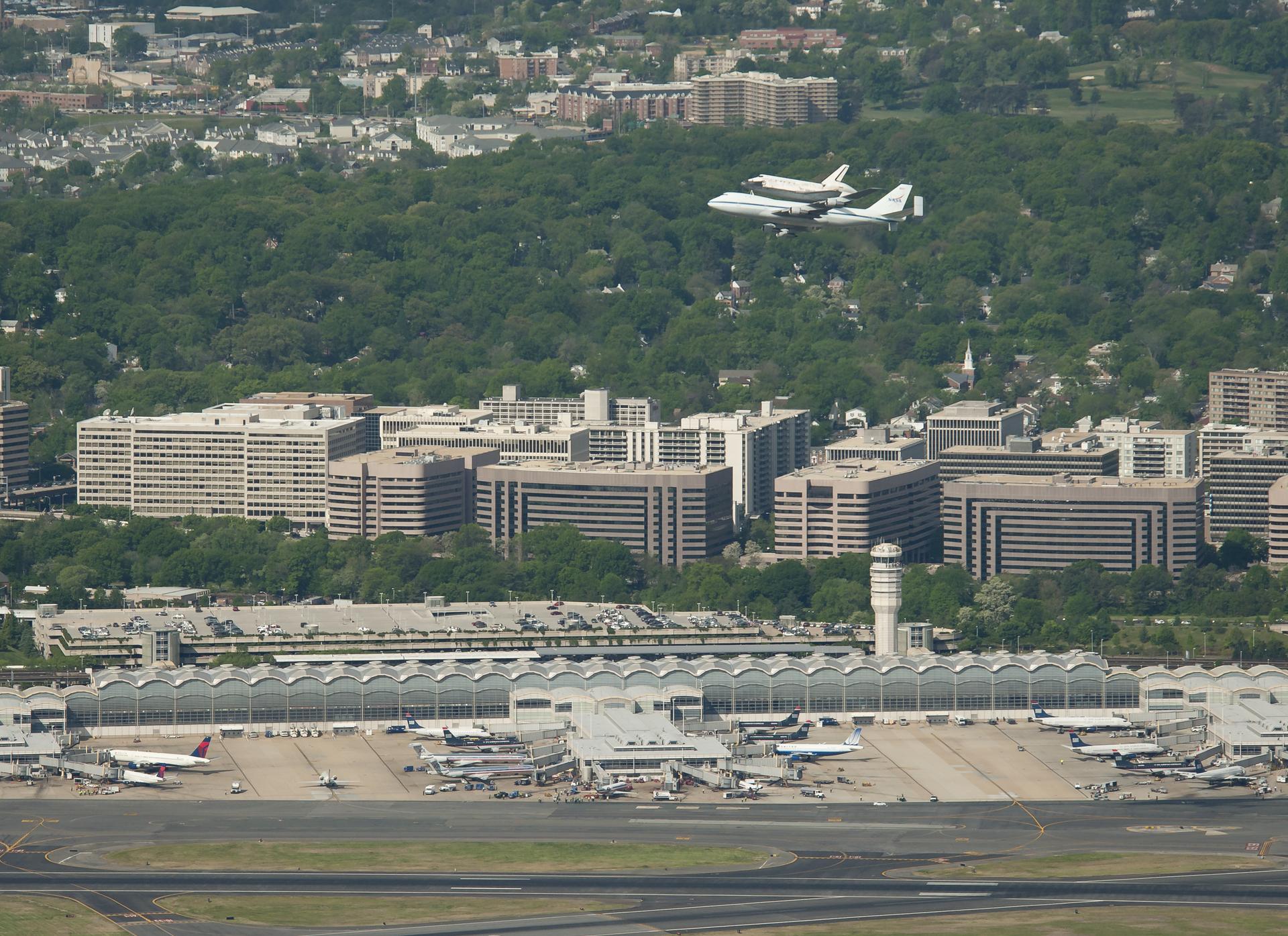 Space shuttle Discovery, mounted atop a NASA 747 Shuttle Carrier Aircraft (SCA) makes its way past Ronald Reagan Washington National Airport, Tuesday, April 17, 2012, in Arlington, Va. Discovery, the first orbiter retired from NASA’s shuttle fleet, completed 39 missions, spent 365 days in space, orbited the Earth 5,830 times, and traveled 148,221,675 miles. NASA will transfer Discovery to the National Air and Space Museum to begin its new mission to commemorate past achievements in space and to educate and inspire future generations of explorers. Photo Credit: (NASA/Bill Ingalls)