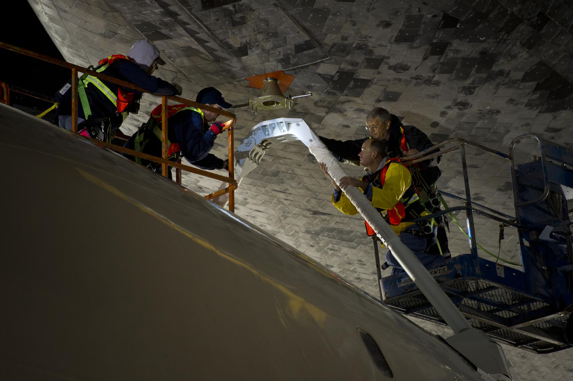 Workers monitor the lift of the space shuttle Discovery from the top of the NASA 747 Shuttle Carrier Aircraft (SCA) at Washington Dulles International Airport, Thursday, April 19, 2012, in Sterling, VA. Discovery, the first orbiter retired from NASA’s shuttle fleet, completed 39 missions, spent 365 days in space, orbited the Earth 5,830 times, and traveled 148,221,675 miles. NASA will transfer Discovery to the National Air and Space Museum to begin its new mission to commemorate past achievements in space and to educate and inspire future generations of explorers. Photo Credit: (NASA/Bill Ingalls)
