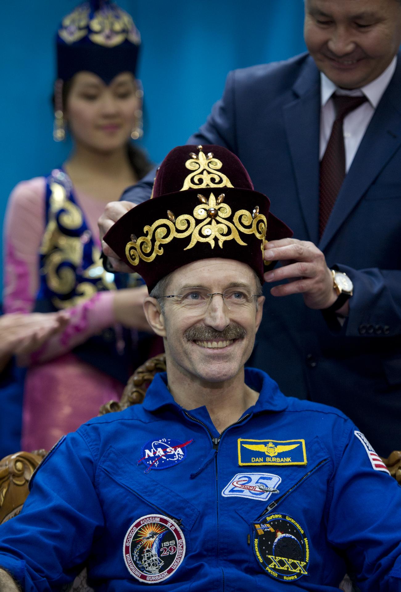 Expedition 30 Commander Daniel Burbank is seen in a gift of traditional Kazakhstan dress during a welcome ceremony at the Kostanay Airport in Kazakhstan on Friday, April 27, 2012. NASA Astronaut Burbank, and Russian Cosmonauts Anton Shkaplerov and Anatoly Ivanishin returned from more than five months onboard the International Space Station where they served as members of the Expedition 29 and 30 crews. Photo Credit: (NASA/Carla Cioffi)