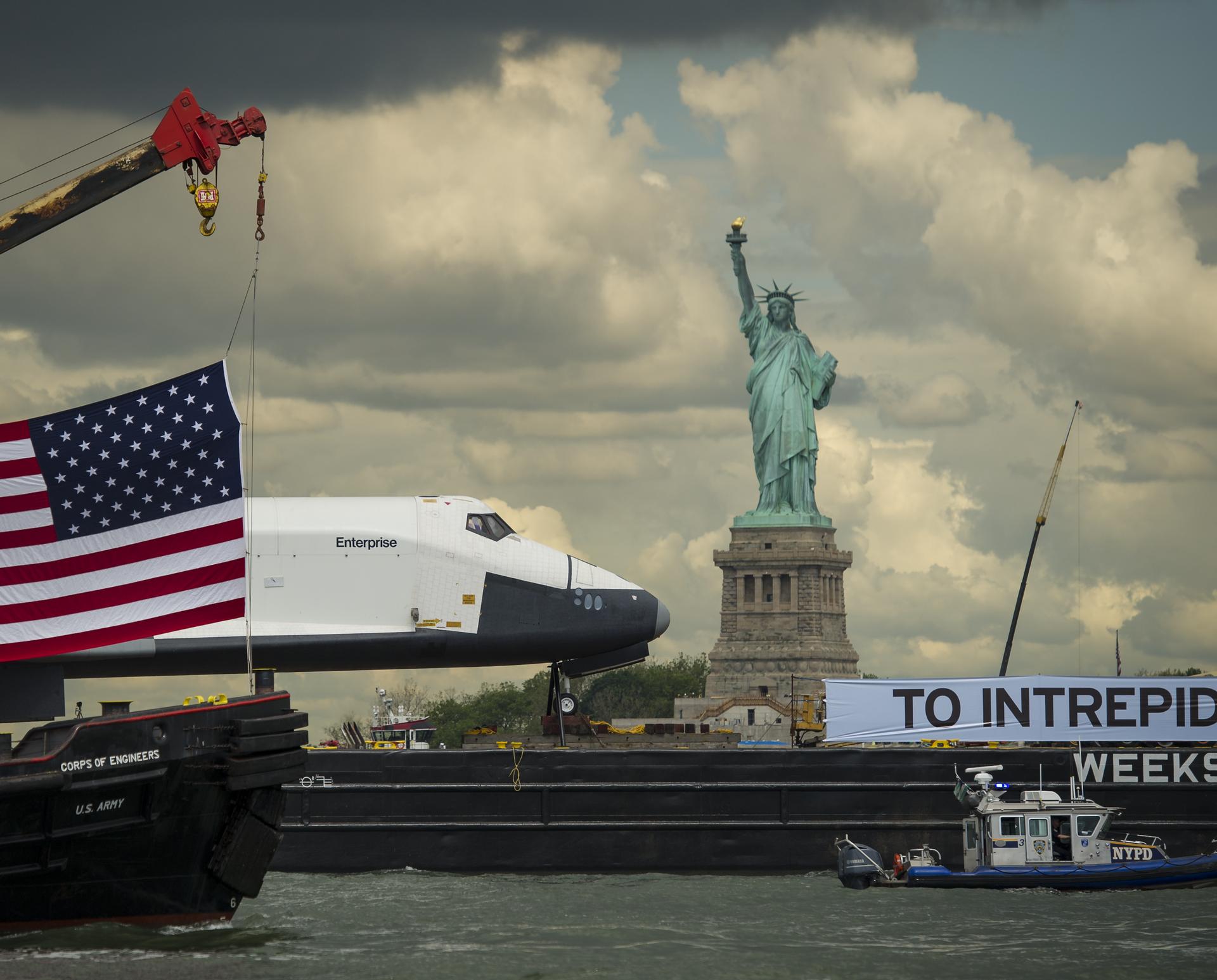 The space shuttle Enterprise, atop a barge, passes the Statue of Liberty in New York on its way to the Intrepid Sea, Air and Space Museum where it will be permanently displayed, Wednesday, June 6, 2012. Photo Credit: (NASA/Bill Ingalls)