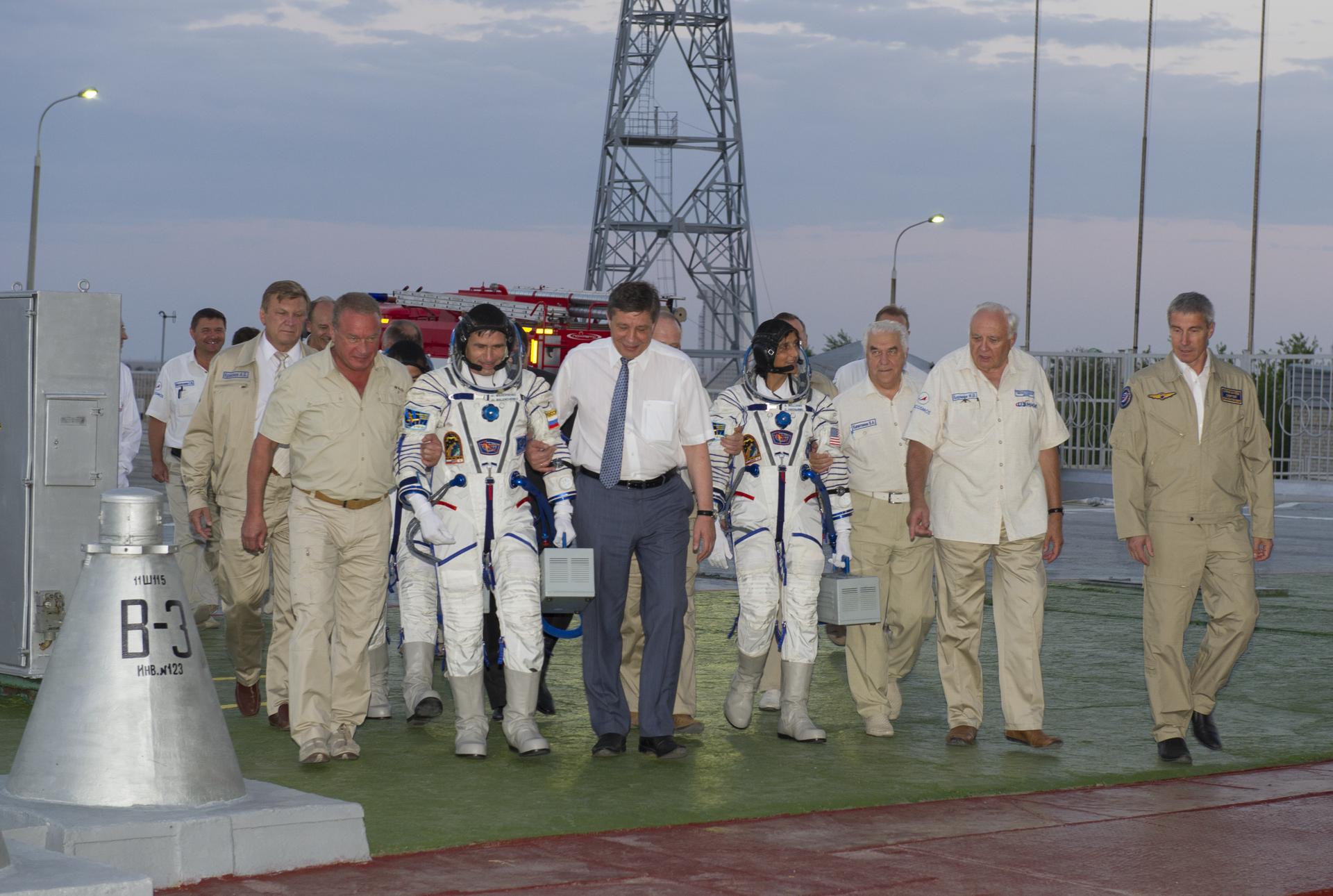Expedition 32 Soyuz Commander Yuri Malenchenko, second from left, and NASA Flight Engineer Sunita Williams are escorted to the Soyuz rocket by senior ROSCOMOS management at the Baikonur Cosmodrome, Sunday, July 15, 2012 in Kazakhstan. The launch of the Soyuz spacecraft with Malenchenko, Williams and JAXA Flight Engineer Akihiko Hoshide aboard launched at 8:40 a.m. Kazakhstan time. Photo Credit (NASA/Carla Cioffi)