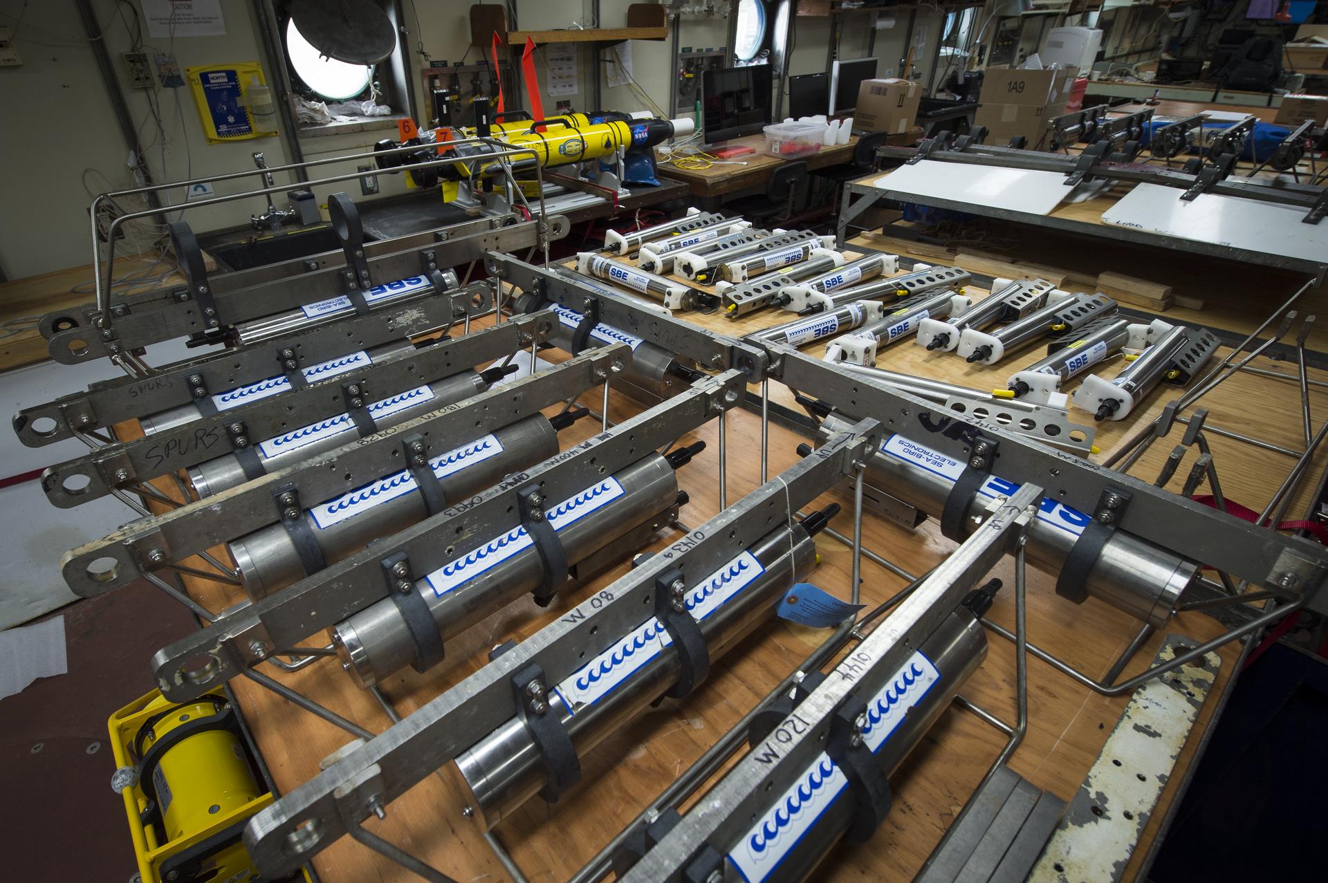 A full suite of instruments are seen onboard the the Woods Hole Oceanographic Institution research vessel Knorr on Tuesday, Sept. 4, 2012, in Woods Hole, Mass. The various instruments will be deployed in the Atlantic Ocean as part of the Salinity Processes in the Upper Ocean Regional Study (SPURS) which is set to sail on Sept. 6. The NASA-sponsored expedition will sail to the North Atlantic's saltiest spot to get a detailed, 3-D picture of how salt content fluctuates in the ocean's upper layers and how these variations are related to shifts in rainfall patterns around the planet. Photo Credit: (NASA/Bill Ingalls)
