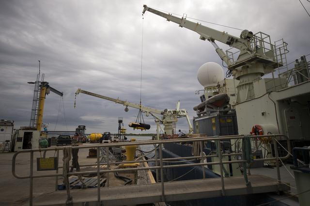 Scientific instruments are loaded onboard the Woods Hole Oceanographic Institution's research vessel Knorr on Tuesday, Sept. 4, 2012, in Woods Hole, Mass. Knorr is scheduled to depart on Sept. 6 to take part in the Salinity Processes in the Upper Ocean Regional Study (SPURS). The NASA-sponsored expedition will sail to the North Atlantic's saltiest spot to get a detailed, 3-D picture of how salt content fluctuates in the ocean's upper layers and how these variations are related to shifts in rainfall patterns around the planet. Photo Credit: (NASA/Bill Ingalls)