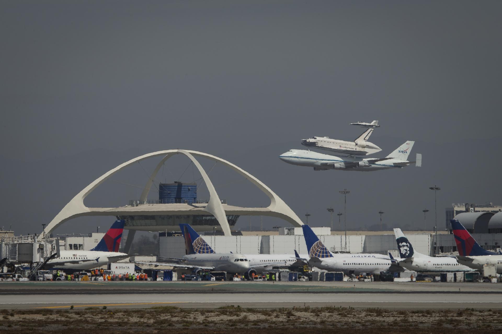 Space shuttle Endeavour, mounted atop a NASA 747 Shuttle Carrier Aircraft (SCA) performs a flyby of the Theme Building at Los Angeles International Airport, Friday, Sept. 21, 2012. Endeavour, built as a replacement for space shuttle Challenger, completed 25 missions, spent 299 days in orbit, and orbited Earth 4,671 times while traveling 122,883,151 miles. Beginning Oct. 30, the shuttle will be on display in the California Science center's Samuel Oschin Space Shuttle Endeavour Display Pavilion, embarking on its new mission to commemorate past achievements in space and educate and inspire future generations of explorers.Photo Credit: (NASA/Scott Andrews)