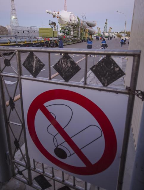 The Soyuz rocket is rolled out to the launch pad by train, on Sunday, October 21, 2012, at the Baikonur Cosmodrome in Kazakhstan. Launch of the Soyuz rocket is scheduled for October 23 and will send Expedition 33/34 Flight Engineer Kevin Ford of NASA, Soyuz Commander Oleg Novitskiy and Flight Engineer Evgeny Tarelkin of ROSCOSMOS on a five-month mission aboard the International Space Station. Photo Credit: (NASA/Bill Ingalls)