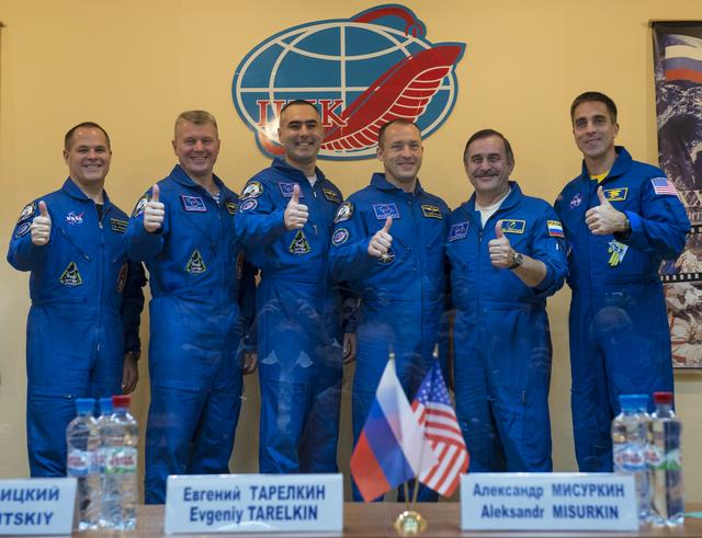 Expedition 33/34 prime crew members from left; Flight Engineer Kevin Ford of NASA, Soyuz Commander Oleg Novitskiy, Flight Engineer Evgeny Tarelkin of ROSCOSMOS, and backup crew members; Russian cosmonaut Alexander Misurkin, Russian cosmonaut Pavel Vinogradov, and NASA astronaut Chris Cassidy pose for a group photograph after the end of a press conference held at the Cosmonaut Hotel, on Monday, October 22, 2012, in Baikonur, Kazakhstan. Launch of the Soyuz rocket is scheduled for October 23 and will send Ford, Novitskiy and Tarelkin on a five-month mission aboard the International Space Station. Photo Credit: (NASA/Bill Ingalls)