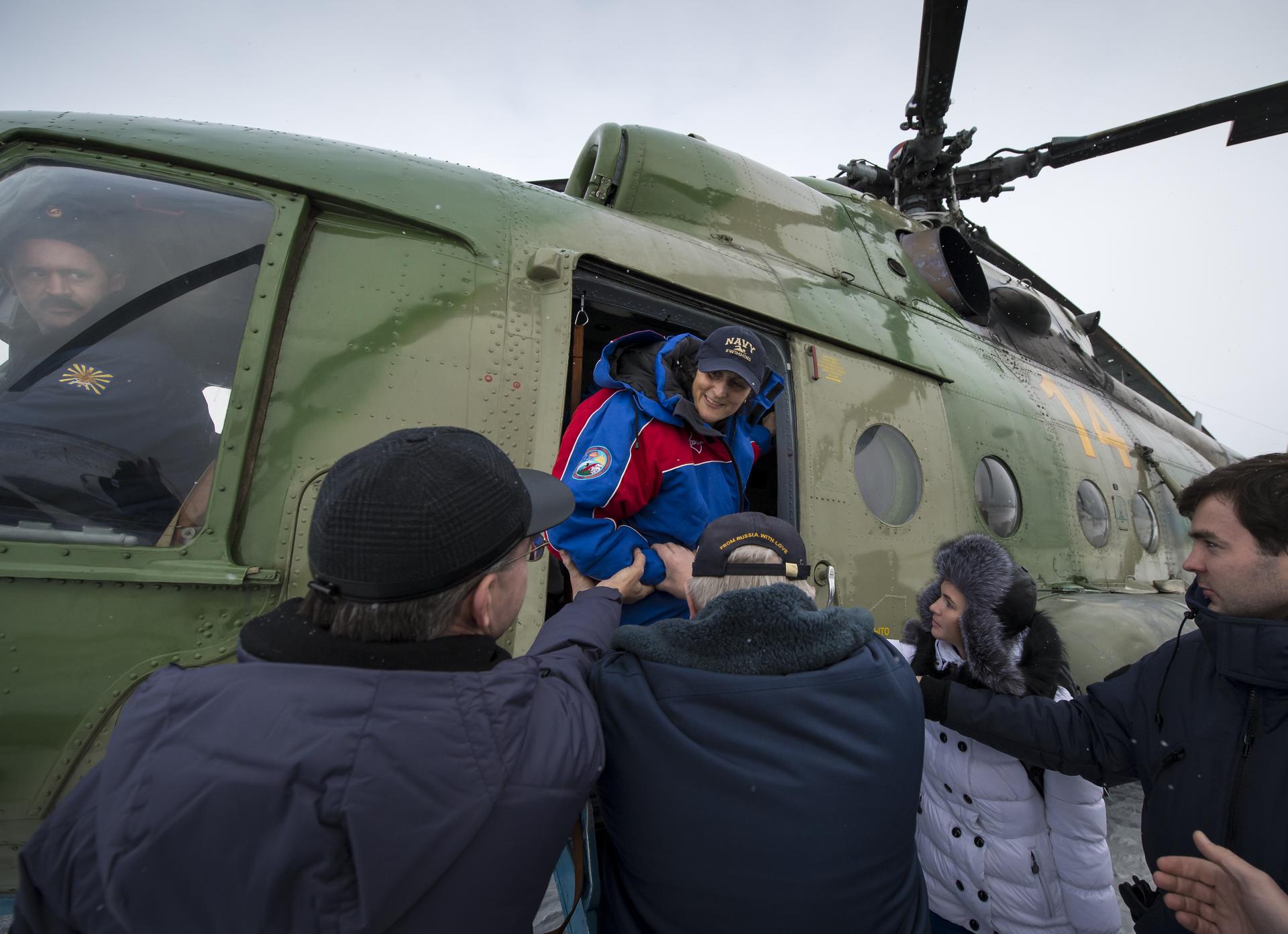 Expedition 33 Commander Sunita Williams of NASA is helped out of a Russian Search and Rescue helicopter after her flight back to Kustanany, Kazakhstan just a few hours after Williams and Flight Engineers Yuri Malenchenko of ROSCOSMOS (Russian Federal Space Agency), and Akihiko Hoshide of JAXA (Japan Aerospace Exploration Agency), landed their Soyuz spacecraft in a remote area outside the town of Arkalyk, Kazakhstan, on Monday, Nov. 19, 2012. Williams, Hoshide and Malenchenko returned from four months onboard the International Space Station. Photo Credit: (NASA/Bill Ingalls)