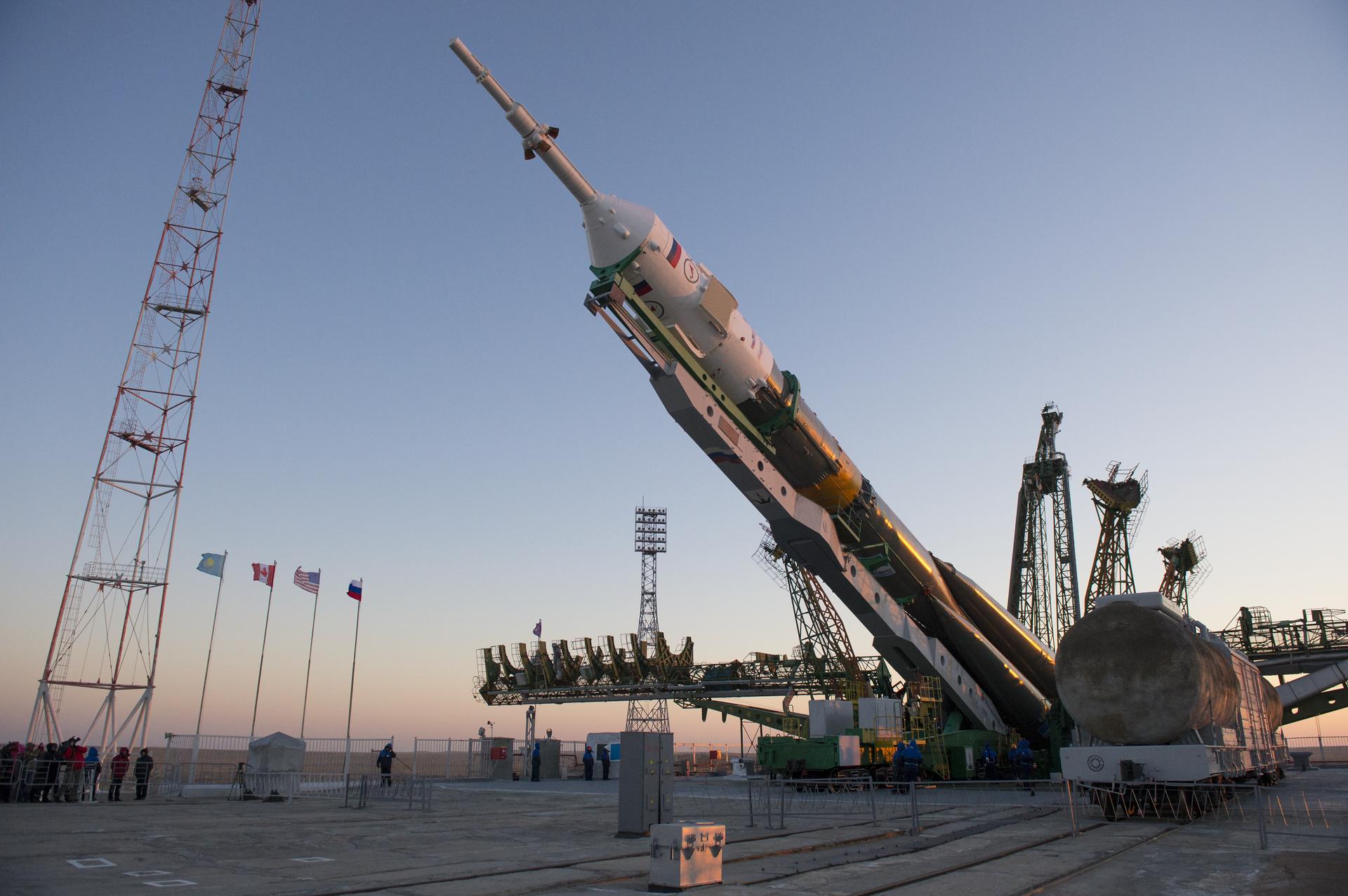 The Soyuz rocket is erected into position after being rolled out to the launch pad by train on Monday, December 17, 2012, at the Baikonur Cosmodrome in Kazakhstan. Launch of the Soyuz rocket is scheduled for December 19 and will send Expedition 34/35 Flight Engineer Tom Marshburn of NASA, Soyuz Commander Roman Romanenko and Expedition 35 Commander Chris Hadfield of the Canadian Space Agency (CSA) on a five-month mission aboard the International Space Station. Photo Credit: (NASA/Carla Cioffi). Photo Credit: (NASA/Carla Cioffi)