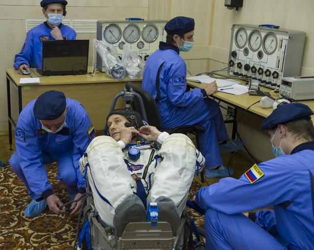 Expedition 34/35 Flight Engineer Tom Marshburn has his Russian Sokol suit pressure checked ahead of his launch onboard a Soyuz TMA-07M spacecraft to the International Space Station with fellow cremates, Flight Engineer Chris Hadfield and Soyuz Commander Roman Romanenko, on Wednesday, Dec. 19, 2012, in Baikonur, Kazakhstan. Launch of the Soyuz rocket will send Marshburn, Romanenko and Hadfield on a five-month mission aboard the International Space Station. Photo Credit: (NASA/GCTC/Andrey Shelepin)