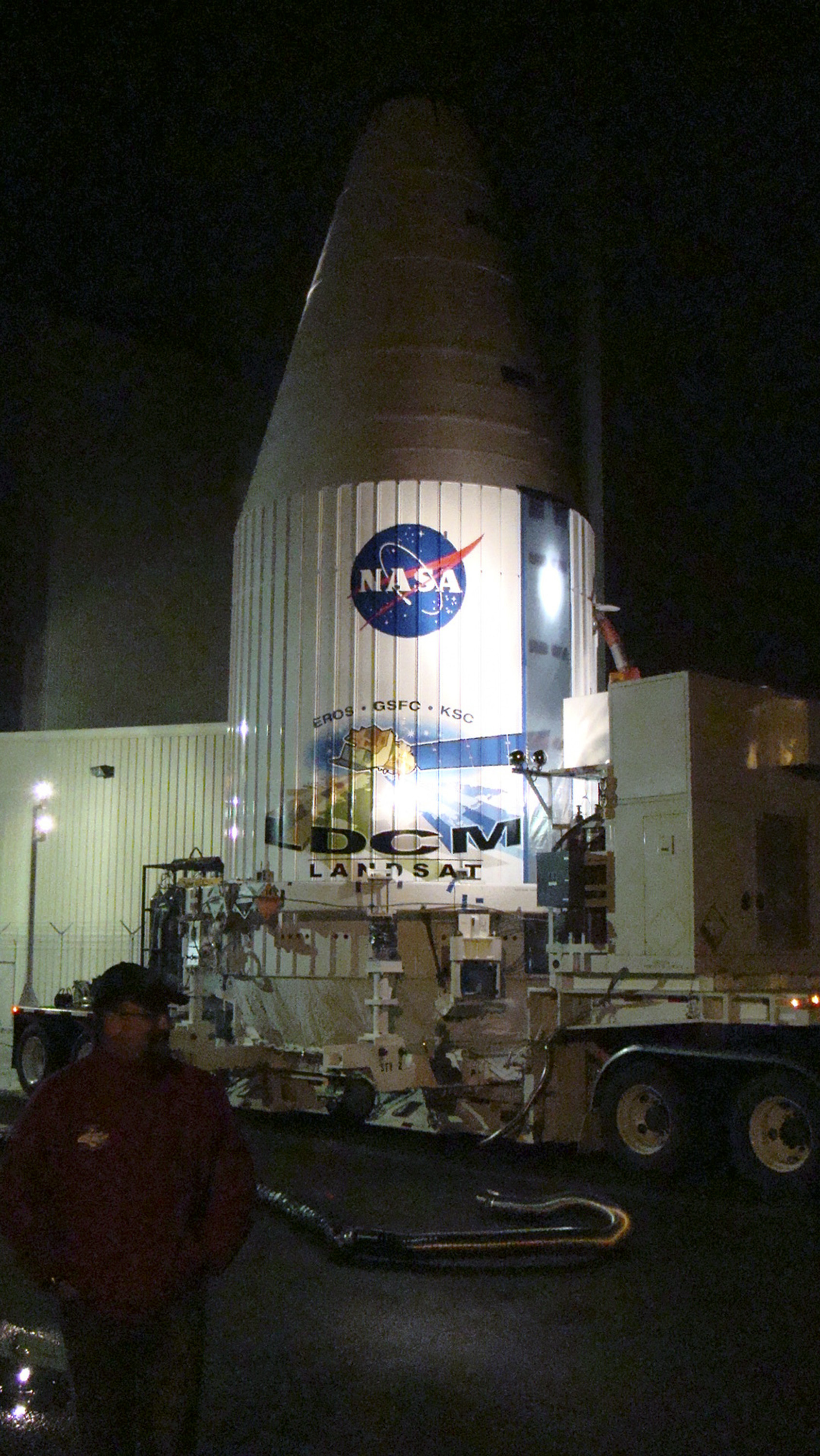 VANDENBERG AIR FORCE BASE, Calif. -- Loaded on a transporter, the payload faring containing the Landsat Data Continuity Mission LDCM spacecraft leaves the Astrotech processing facility at Vandenberg Air Force Base in California and heads toward the launch pad at Space Launch Complex-3E. There it will be hoisted atop a United Launch Alliance Atlas V for launch. LDCM is the eighth satellite in the Landsat Program series of Earth-observing missions jointly managed by NASA and the U.S. Geological Survey. LDCM will continue the program’s critical role in monitoring, understanding and managing the resources needed for human sustainment such as food, water and forests. Photo credit: NASA_VAFB
