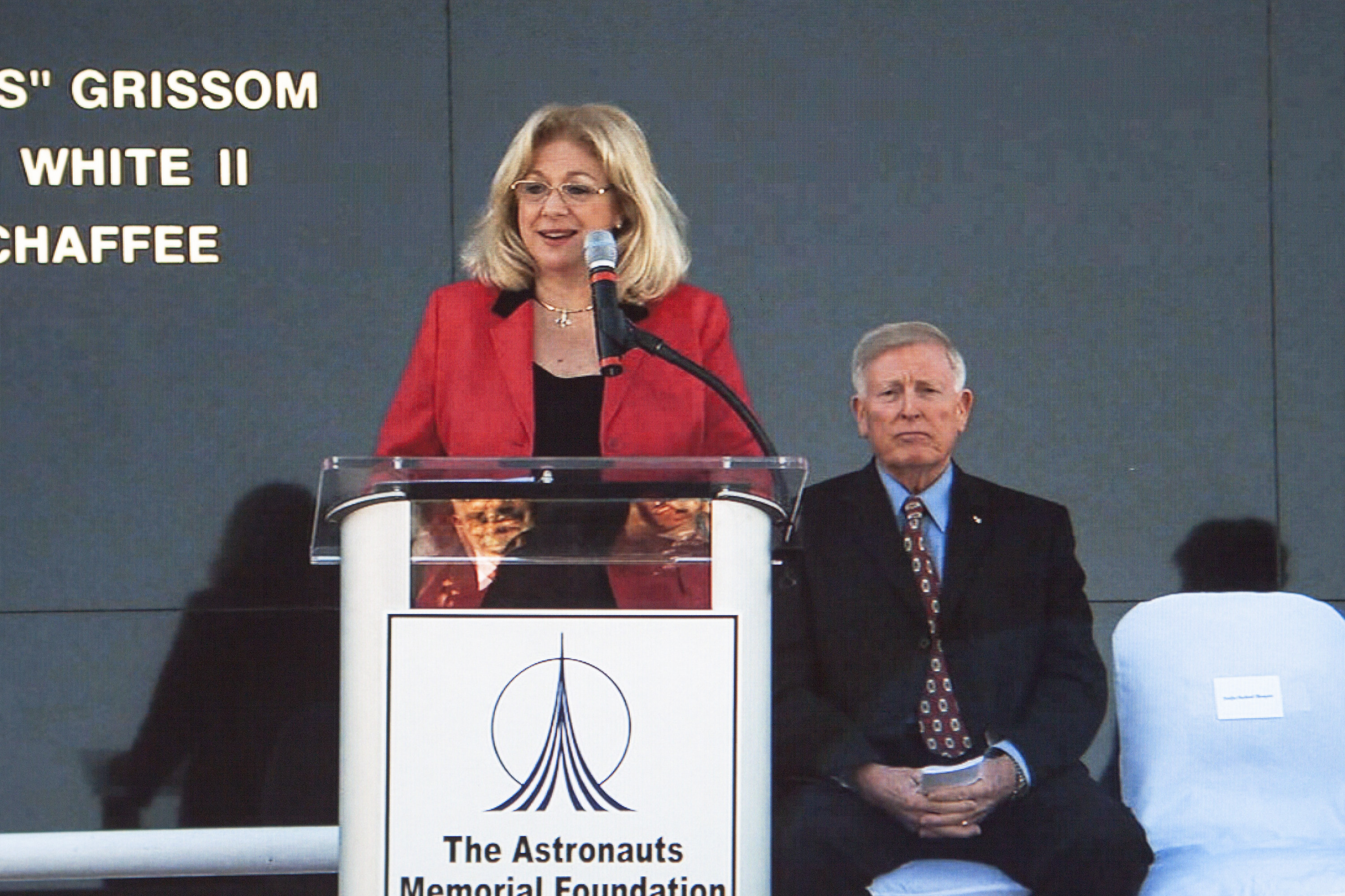CAPE CANAVERAL, Fla. -- Evelyn Husband-Thompson, widow of STS-107 commander Rick Husband, speaks during the Day of Remembrance ceremony. Visible to the right is former NASA astronaut Jon McBride, chairman of the Astronauts Memorial Foundation board of directors. Space center employees and guests gathered at the Space Mirror Memorial at the visitor complex for the annual event which took place on the 10th anniversary of the loss of the space shuttle Columbia and its crew. The ceremony also honored the astronauts of Apollo 1 and the shuttle Challenger. Dedicated in 1991, the names of fallen astronauts are emblazoned the Space Mirror Memorial's 4.5-foot-high-by-50-foot-wide polished black granite surface which reflects the sky and has been designated by Congress as a National Memorial. Image credit: NASA Television