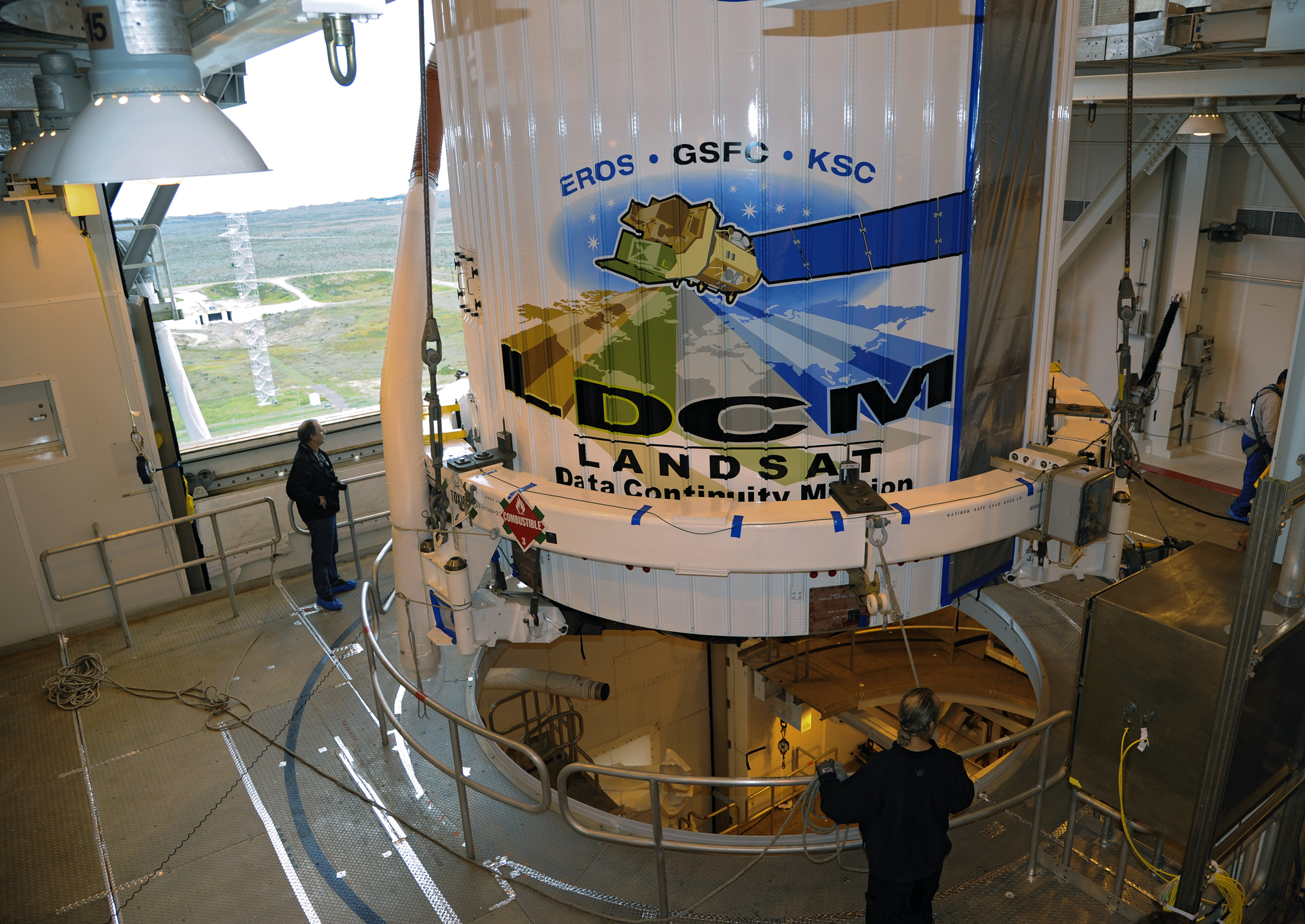 VANDENBERG AFB, Calif. -- The payload fairing containing the Landsat Data Continuity Mission, or LDCM, spacecraft has been lifted to the top of Space Launch Complex-3E at Vandenberg Air Force Base, Calif. where it is about to be mounted atop a United Launch Alliance Atlas V rocket. The Landsat Data Continuity Mission LDCM is the future of Landsat satellites. It will continue to obtain valuable data and imagery to be used in agriculture, education, business, science, and government. The Landsat Program provides repetitive acquisition of high resolution multispectral data of the Earth's surface on a global basis. The data from the Landsat spacecraft constitute the longest record of the Earth's continental surfaces as seen from space. It is a record unmatched in quality, detail, coverage, and value. Liftoff is planned for Feb. 11, 2013 aboard a United Launch Alliance Atlas V rocket. For more information, visit: http:__www.nasa.gov_mission_pages_landsat_main_index.html Photo credit: NASA