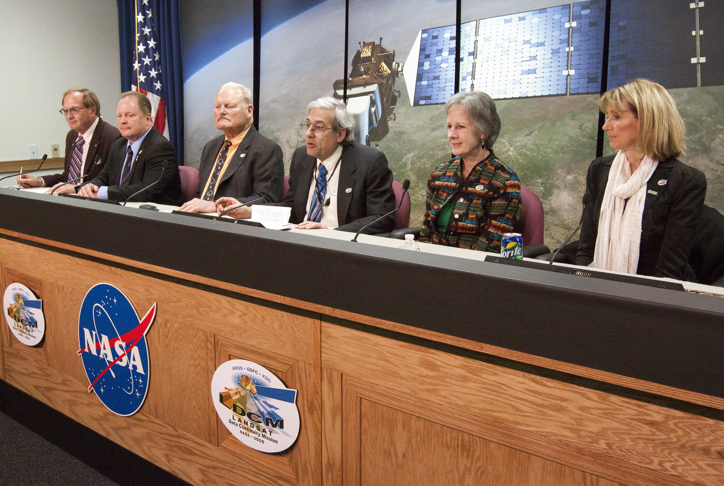 VANDENBERG AIR FORCE BASE, Calif. -- Media attending a post-launch news conference at Vandenberg Air Force Base, Calif. heard from officials who described the successful launch of the Landsat Data Continuity Mission, or LDCM. From the left are: George Diller of NASA Public Affairs, Ken Schwer, LDCM project manager Goddard Space Flight Center, Greenbelt, Md., Michael Luther, deputy associate administrator for programs, Science Mission Directorate at NASA Headquarters, Michael Freilich, director of the Earth Science Division, Science Mission Directorate, at Headquarters, Anne Castle, assistant secretary for Water and Science, U.S. Department of the Interior, and Marsha McNutt, director of the U.S. Geological Survey. The Landsat Data Continuity Mission LDCM is the future of Landsat satellites. It will continue to obtain valuable data and imagery to be used in agriculture, education, business, science, and government. The Landsat Program provides repetitive acquisition of high resolution multispectral data of the Earth's surface on a global basis. The data from the Landsat spacecraft constitute the longest record of the Earth's continental surfaces as seen from space. It is a record unmatched in quality, detail, coverage, and value. Liftoff took place at 10:02 a.m. PST 1:02 P.M. EST) on Feb. 11, 2013 aboard a United Launch Alliance Atlas V rocket. For more information, visit: http:__www.nasa.gov_mission_pages_landsat_main_index.html Photo credit: NASA_Kim Shiflett