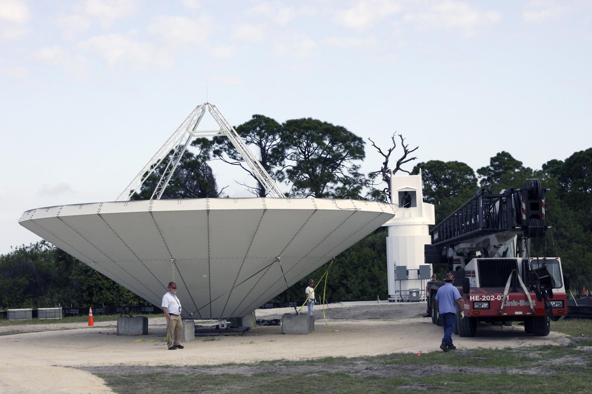 CAPE CANAVERAL, Fla. – At NASA’s Kennedy Space Center in Florida, 40-foot-diameter dish antenna arrays are being constructed as part of the Antenna Test Bed Array for the Ka-Band Objects Observation and Monitoring, or Ka-BOOM system. The antennas will be part of the operations command center facility. The construction site is near the former Vertical Processing Facility, which has been demolished. The Ka-BOOM project is one of the final steps in developing the techniques to build a high power, high resolution radar system capable of becoming a Near Earth Object Early Warning System. While also capable of space communication and radio science experiments, developing radar applications is the primary focus of the arrays. Photo credit: NASA_Jim Grossmann