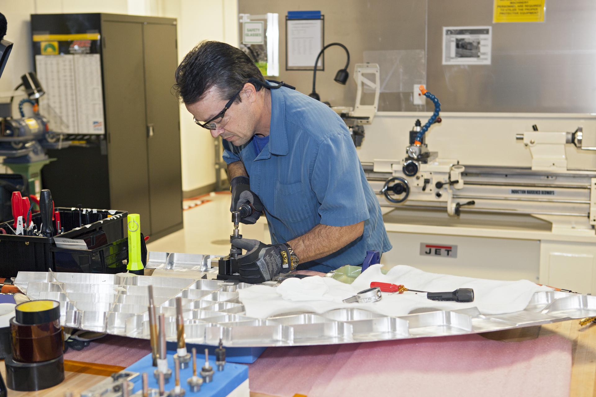 CAPE CANAVERAL, Fla. -- Inside the Operations and Checkout Building high bay at NASA’s Kennedy Space Center in Florida, a technician practices a procedure to repair cracks on the agency’s Orion Exploration Flight Test 1 crew module, during a dry run. During proof pressure testing on the vehicle, the spacecraft sustained three cracks in the aft bulkhead. A team composed of Lockheed Martin and NASA engineers designed a set of brackets that will be used to repair the area, as well as tooling to fix the cracked structure. Orion is the exploration spacecraft designed to carry humans further into space than ever before. It will provide emergency abort capability, sustain the crew during the space travel and provide safe re-entry from deep space return velocities. Orion’s first unpiloted test flight is scheduled to launch in 2014 atop a United Launch Alliance Delta IV heavy rocket. A second uncrewed flight test is scheduled for 2017 on the Space Launch System rocket. For more information, visit http:__www.nasa.gov_orion. Photo credit: NASA_Dimitri Gerondidakis