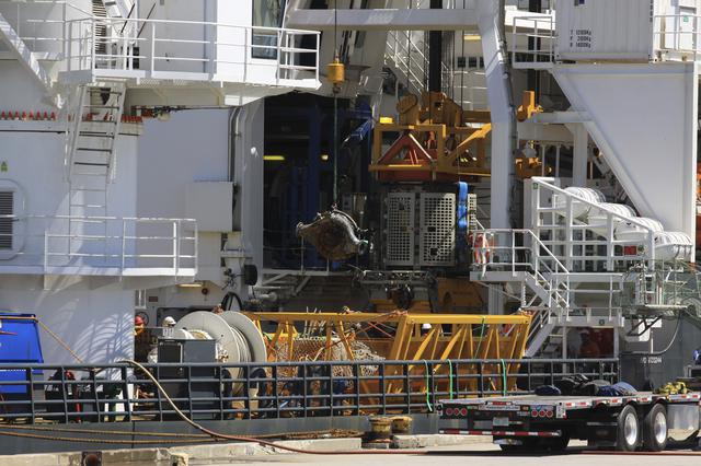 CAPE CANAVERAL, Fla. – Components for two of the F-1 engines that powered the first stage of the Saturn V rockets that lifted NASA's Apollo missions to the moon were recovered from the Atlantic Ocean March 21 by Jeff Bezos, the founder and Chief Executive Officer of the aerospace company Blue Origin and Amazon.com and arrived at Port Canaveral March 22. The engines will be restored by Bezos' team for public display. The engines were found some 14,000 feet underwater where they came to rest more than 40 years ago after sending astronauts into space on missions to the moon. Restoration may reveal exactly which engines were recovered, but Bezos said in a statement that the serial numbers were not immediately visible. Photo credit: NASA_Kim Shiflett