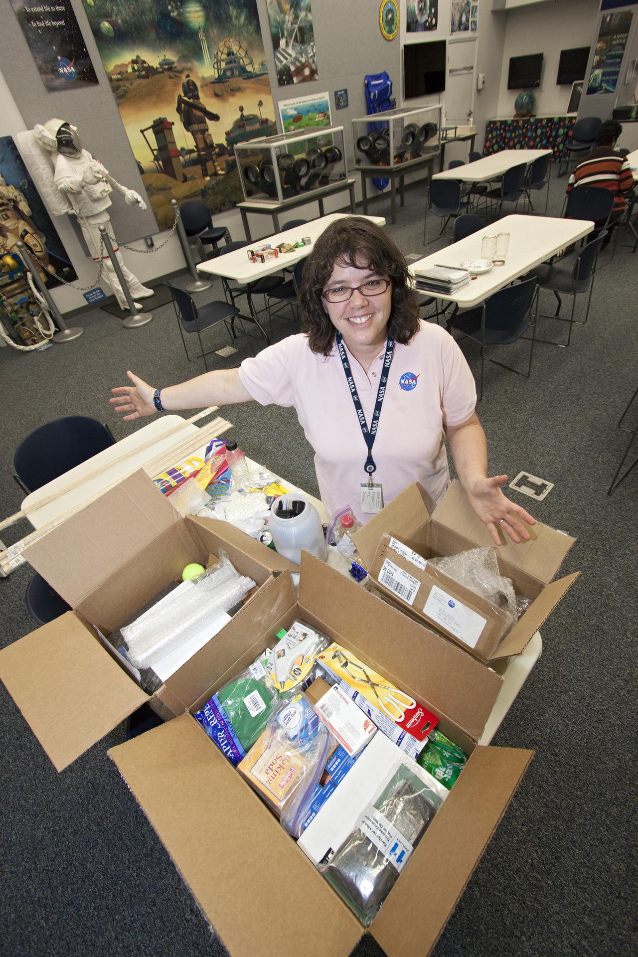 CAPE CANAVERAL, Fla. – Inside the Educator Resource Center at NASA’s Kennedy Space Center Visitor Complex in Florida, science teacher April Lanotte displays materials used for the Museum in a Box activities for K-12 students. Lanotte, who is an Albert Einstein Distinguished Educator Fellow working in NASA’s Aeronautics Research Mission Directorate, was at Kennedy to train education specialists and Kennedy Educate to Innovate program volunteers in the new series of lessons and activities. The Museum in a Box is a program designed to teach physical science through aeronautics using hands-on activities and experiments. Photo credit: NASA_Jim Grossmann