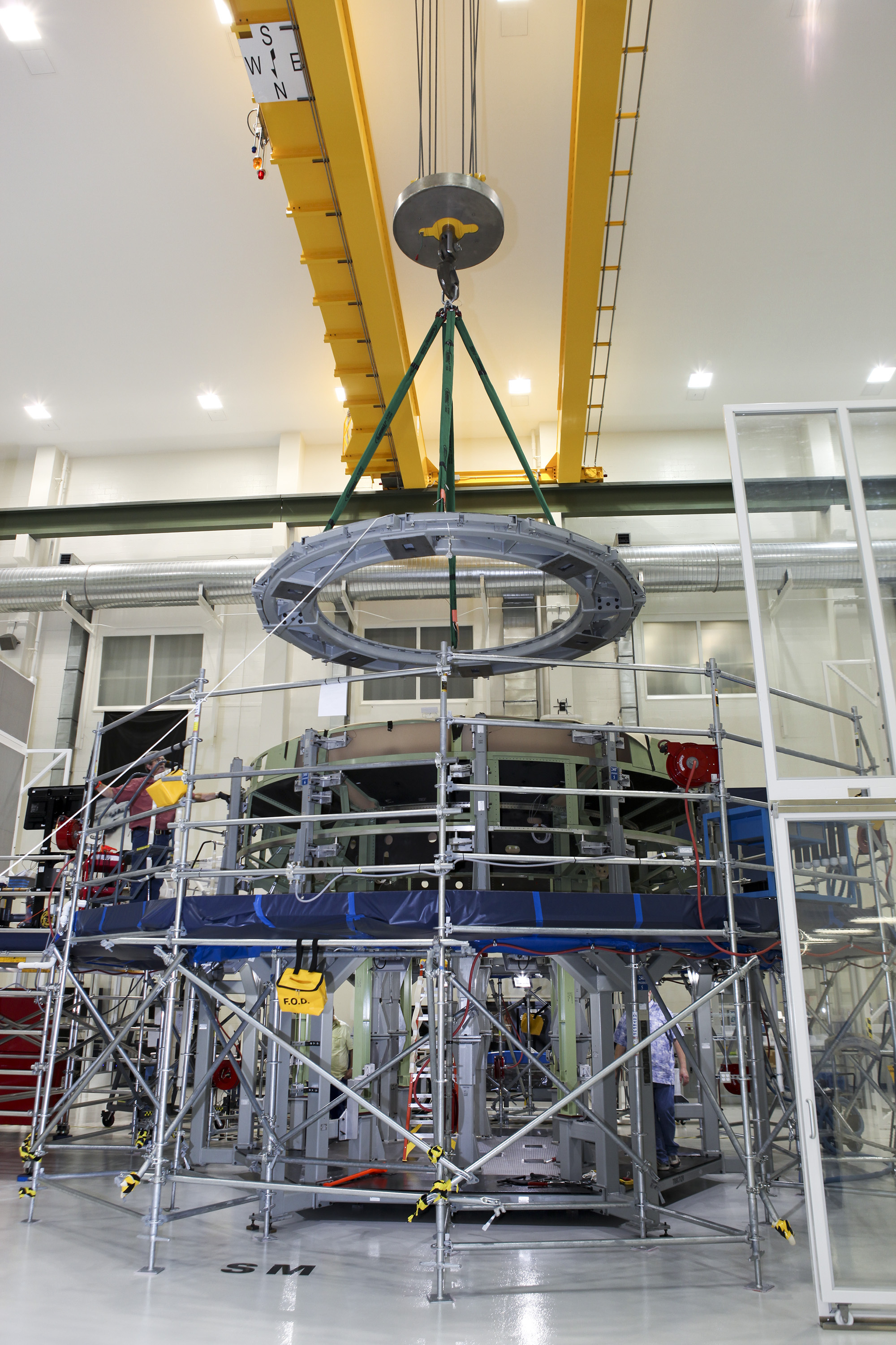 CAPE CANAVERAL, Fla. – Inside the Operations and Checkout Building high bay at NASA’s Kennedy Space Center in Florida, a processing tool is lifted out of an Orion service module work stand. Work continues to prepare for Exploration Flight Test 1, or EFT-1. Orion is the exploration spacecraft designed to carry crews to space beyond low Earth orbit. It will provide emergency abort capability, sustain the crew during the space travel and provide safe re-entry from deep space return velocities. Orion’s first unpiloted test flight is scheduled to launch in 2014 atop a United Launch Alliance Delta IV heavy rocket. A second uncrewed flight test is scheduled for 2017 on the Space Launch System rocket. For more information, visit http:__www.nasa.gov_orion. Photo credit: NASA_Charisse Nahser