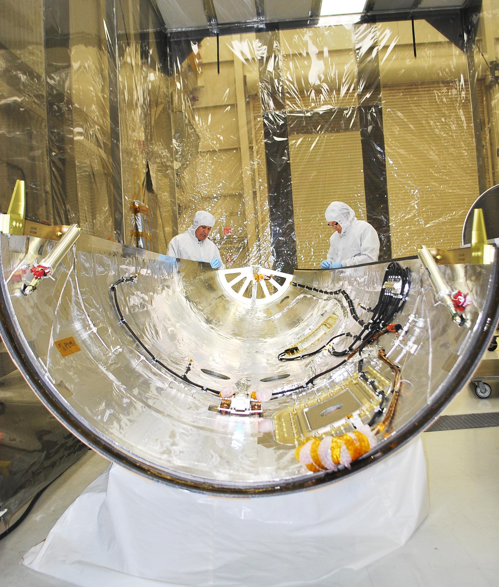 VANDENBERG AIR FORCE BASE, Calif. -- Technicians inside Building 1555 conduct inspection, cleaning and electrical testing on half of a payload fairing for the Orbital Sciences Corp. Pegasus XL rocket that will launch the Interface Region Imaging Spectrograph, or IRIS, spacecraft. The fairing will be fitted to the nose of the Pegasus to protect the spacecraft from atmospheric heating and stress during launch. IRIS will open a new window of discovery by tracing the flow of energy and plasma through the chromospheres and transition region into the sun’s corona using spectrometry and imaging. IRIS fills a crucial gap in our ability to advance studies of the sun-to-Earth connection by tracing the flow of energy and plasma through the foundation of the corona and the region around the sun known as the heliosphere. Photo credit: VAFB_Randy Beaudoin