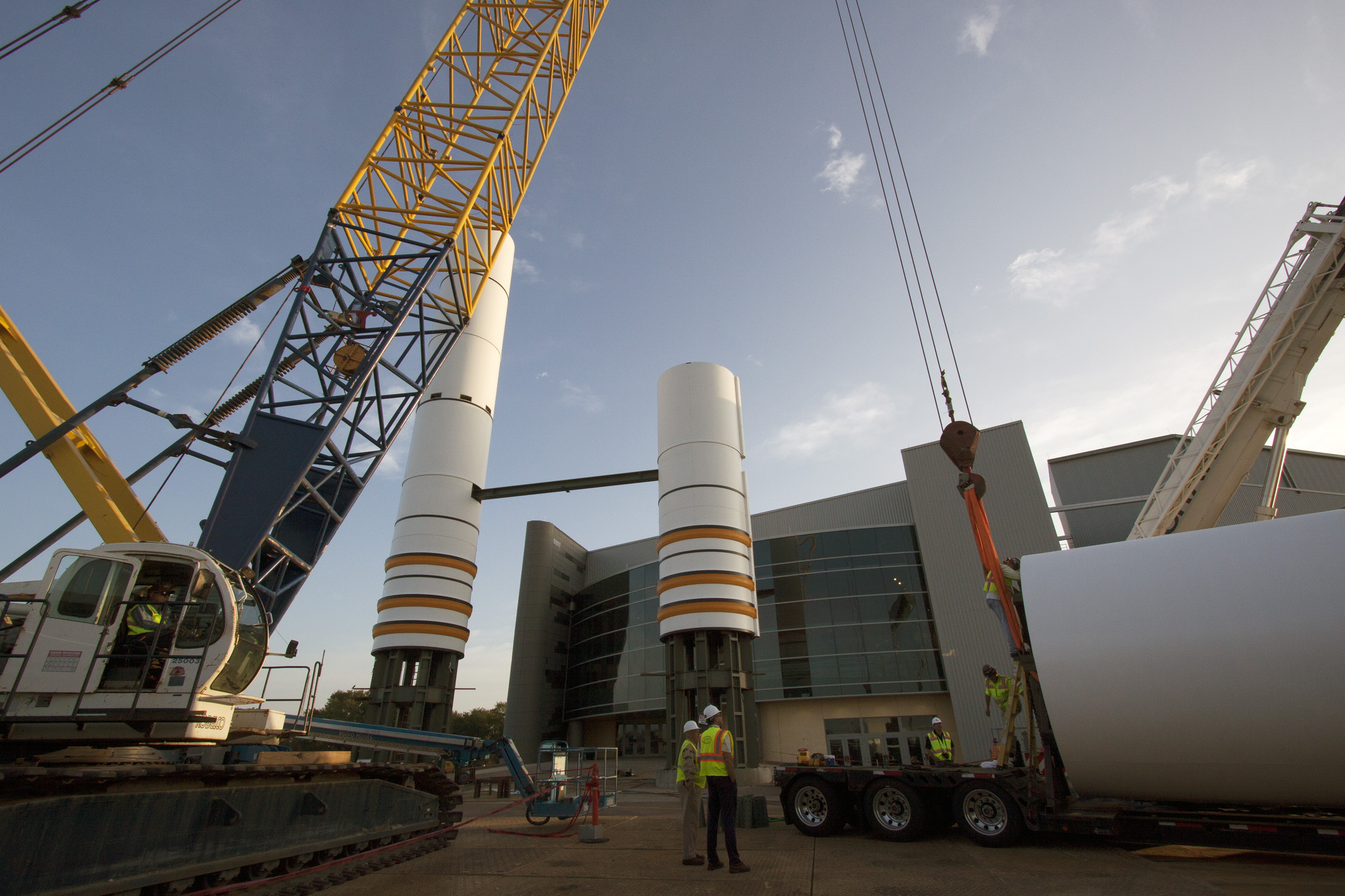 CAPE CANAVERAL, Fla. – Workers prepare to lift a segment for a set of twin, full-size replica Solid Rocket Boosters SRBs in front of the Space Shuttle Atlantis exhibit under construction at the Kennedy Space Center Visitor Complex in Florida. Atlantis is housed in the building behind the SRB stack. An external tank replica will be added later to the middle of the SRBs to complete the display. The SRBs stand 150 feet tall, while the external tank will reach 184 feet when it is finished. The shuttle was mounted to the stack and depended on the power of the SRBs to lift it off the launch pad and start it on its way to space. The external tank was loaded with liquid propellants for the shuttle's three main engines. Photo credit: NASA_Jim Grossmann