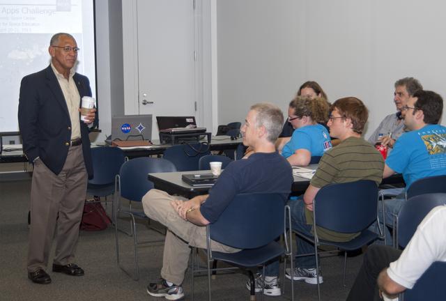 CAPE CANAVERAL, Fla. – NASA Administrator Charlie Bolden speaks with participants of the 2013 International Space Apps Challenge, or ISAC, at The Astronaut Memorial Foundation’s Center for Space Education in Florida during a networking event. During the worldwide two-day challenge, more than 9,000 people and 484 organizations came together in 83 cities across 44 countries, as well as online, to develop new ways of solving challenges that NASA faces. At Kennedy, four teams brainstormed ideas with subject matter experts and others and worked nearly 32 hours straight to present their concepts to a panel of three technical and non-technical judges. Challenges tackled at Kennedy were: Deployable Greenhouse, Kennedy Space Center 2040, Seven Minutes of Science, and Moonville – Lunar Industry Game. Photo credit: NASA_Charisse Nahser