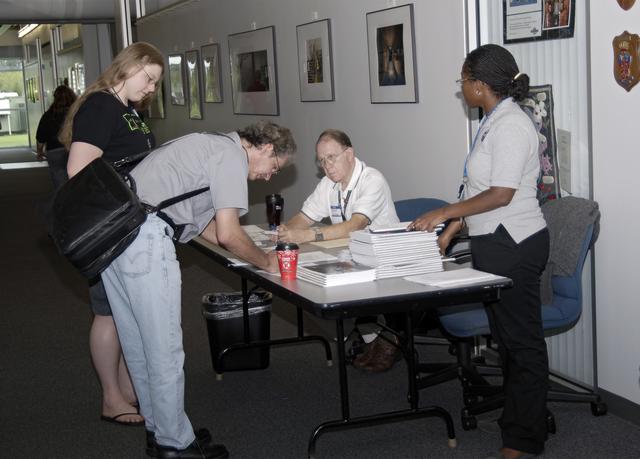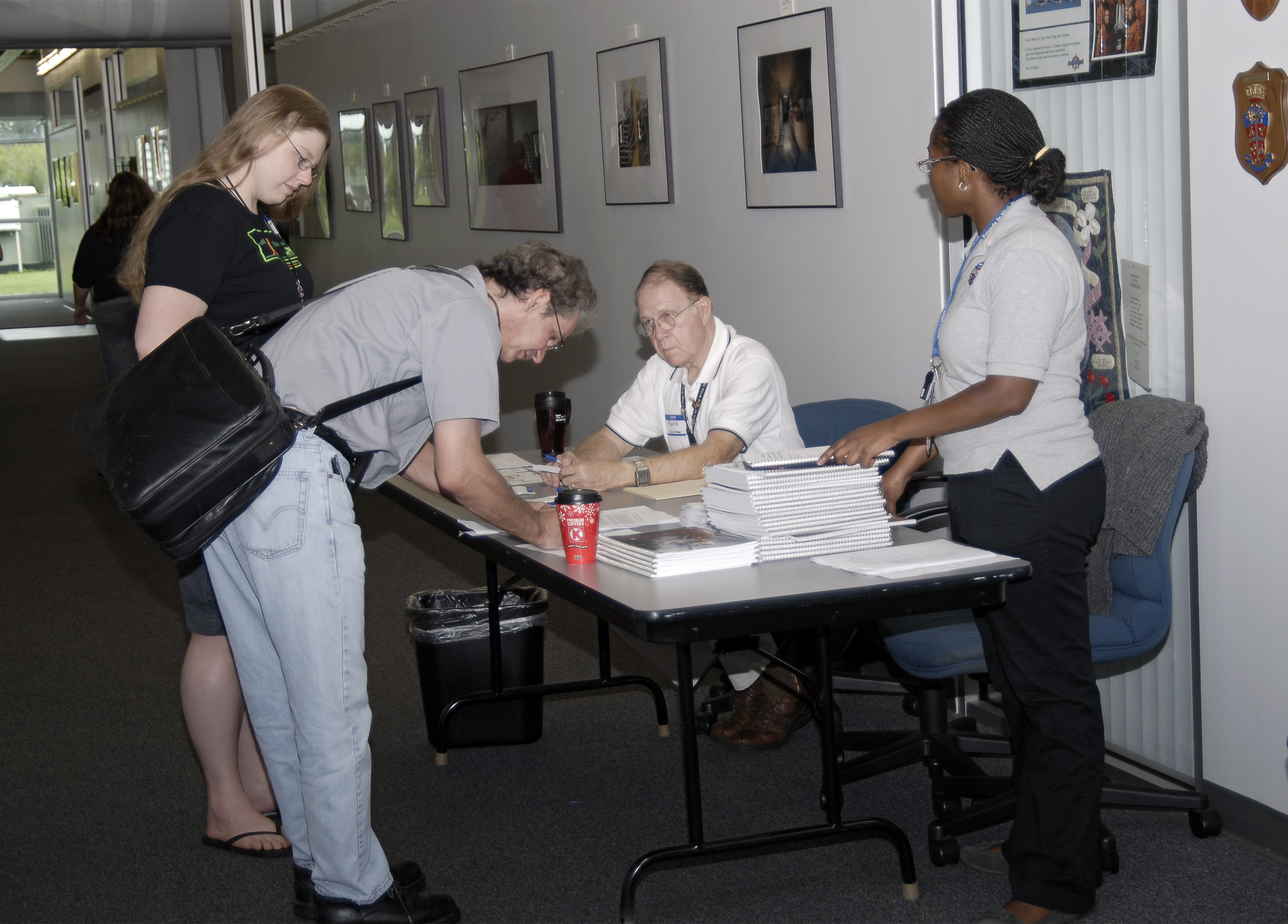 CAPE CANAVERAL, Fla. – Participants sign in at the Center for Space Education at the Kennedy Space Center Visitor Complex in Florida for the 2013 International Space Apps Challenge. . During the worldwide two-day challenge, more than 9,000 people and 484 organizations came together in 83 cities across 44 countries, as well as online, to develop new ways of solving challenges that NASA faces. At Kennedy, four teams brainstormed ideas with subject matter experts and others and worked nearly 32 hours straight to present their concepts to a panel of three technical and non-technical judges. Challenges tackled at Kennedy were: Deployable Greenhouse, Kennedy Space Center 2040, Seven Minutes of Science, and Moonville – Lunar Industry Game. Photo credit: NASA_Charisse Nahser