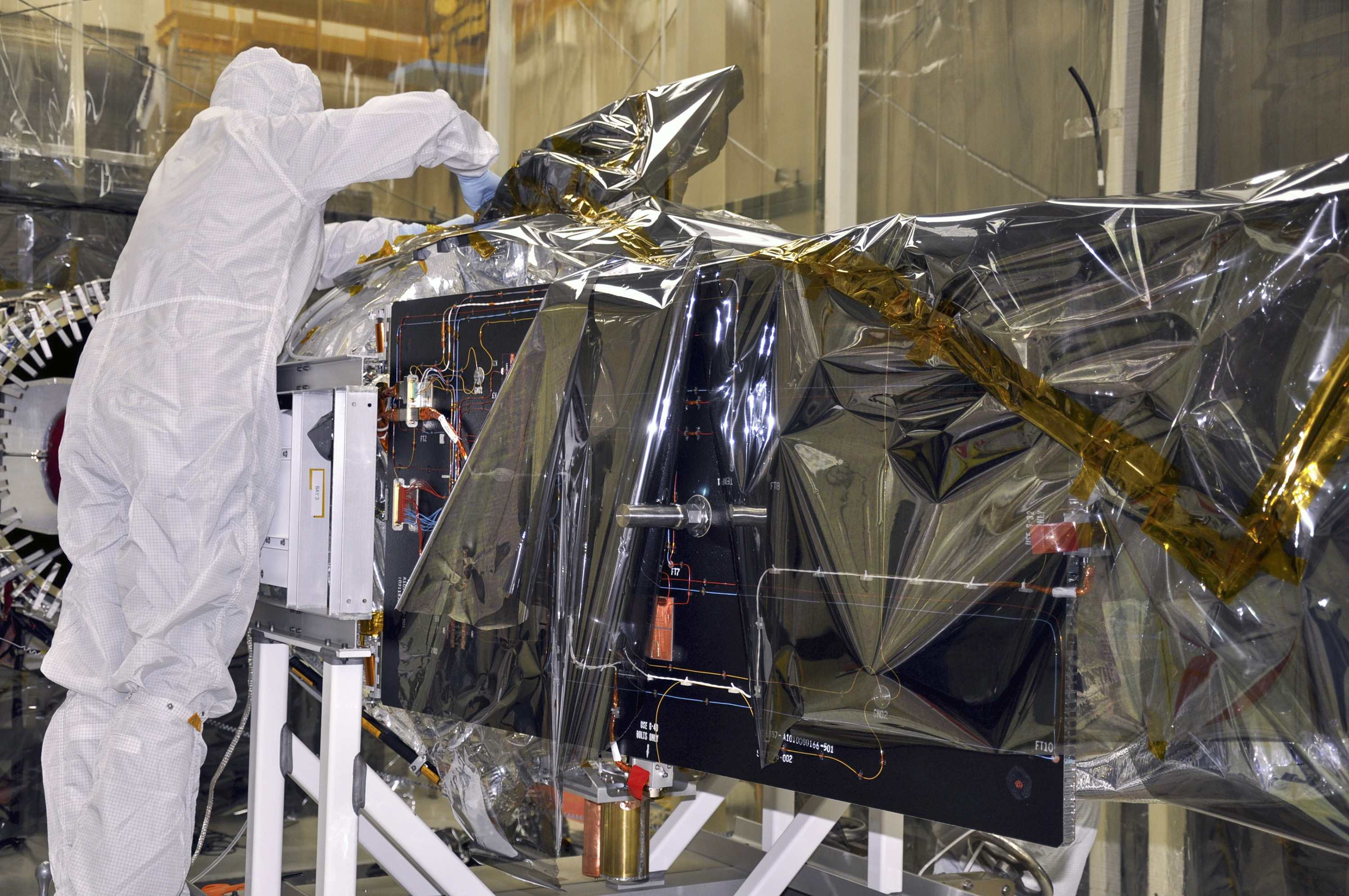 VANDENBERG AFB, Calif. – A technician removes protective Mylar wrapping from NASA's IRIS spacecraft in a clean room at Vandenberg where the spacecraft will be readied for launch aboard an Orbital Sciences Pegasus XL rocket. IRIS is short for Interface Region Imaging Spectrograph and the spacecraft's mission will improve our understanding of how heat and energy move through the deepest levels of the sun’s atmosphere, thereby increasing our ability to forecast space weather. Photo credit: VAFB_Randy Beaudoin