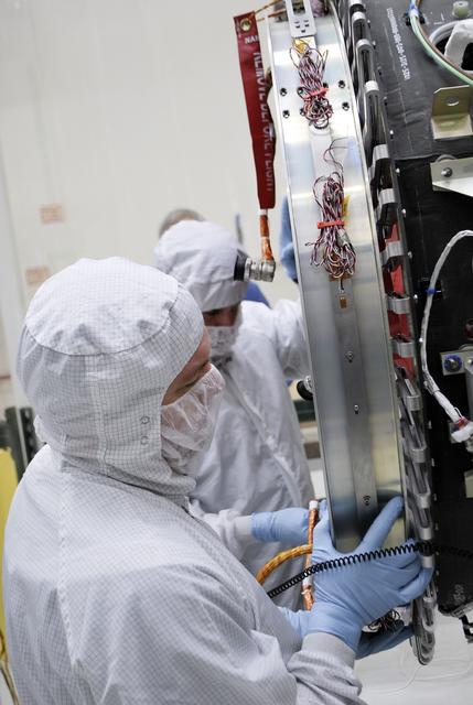 VANDENBERG AFB, Calif. – Technicians test fit the separation system that will push NASA's IRIS spacecraft away from an Orbital Pegasus XL rocket when IRIS reaches its proper orbit after launch. IRIS is short for Interface Region Imaging Spectrograph and the spacecraft's mission will improve our understanding of how heat and energy move through the deepest levels of the sun’s atmosphere, thereby increasing our ability to forecast space weather. Photo credit: VAFB_Randy Beaudoin