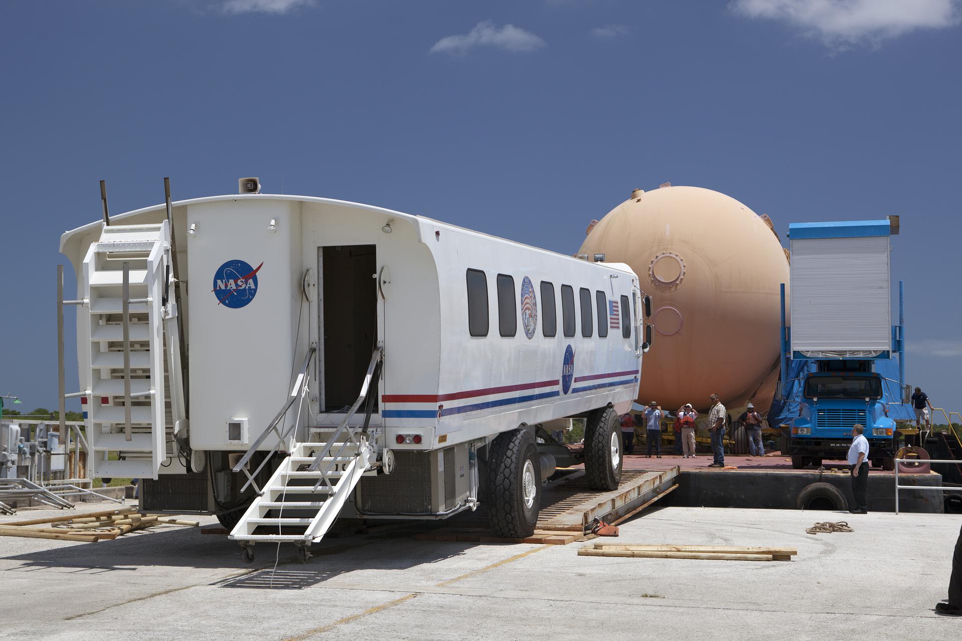 CAPE CANAVERAL, Fla. – The space shuttle crew transport vehicle is loaded onto a barge for the first leg of its journey from NASA's Kennedy Space Center in Florida to the Wings of Dreams Aviation Museum located at Keystone Heights Airport in North Central Florida. Also joining the vehicle at Wings of Dreams is an orange flight test article external fuel tank, or ET, an ET transporter, crew hatch access vehicle, solid rocket booster, or SRB, aft skirt and SRB frustum. Thousands of unique space shuttle era artifacts are being allocated to facilities across the country for their new missions to educate and inspire America's next generation of explorers. Photo credit: NASA_Dimitri Gerondidakis