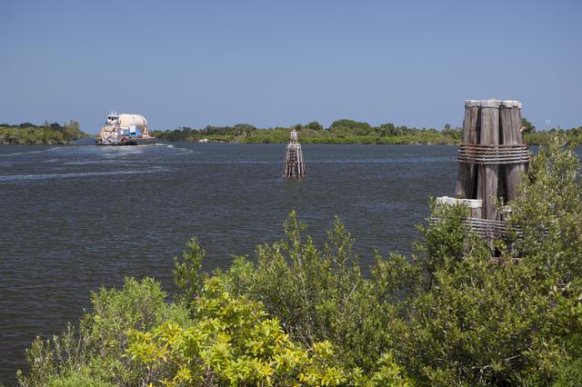 CAPE CANAVERAL, Fla. -- A space shuttle orange flight test article external fuel tank, or ET, an ET transporter, crew hatch access vehicle, crew transport vehicle, solid rocket booster, or SRB, aft skirt and SRB frustum are loaded onto a barge and beginning the first leg of their journey down the Banana River from NASA's Kennedy Space Center in Florida to the Wings of Dreams Aviation Museum located at Keystone Heights Airport in North Central Florida. Thousands of unique space shuttle era artifacts are being allocated to facilities across the country for their new missions to educate and inspire America's next generation of explorers. Photo credit: NASA_Dimitri Gerondidakis