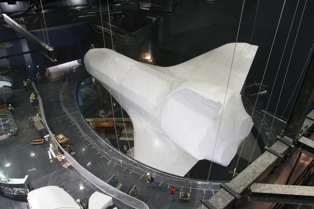 CAPE CANAVERAL, Fla. -- At the Kennedy Space Center Visitor Complex in Florida, construction crews prepare to remove 16,000 square feet of plastic shrink-wrap from the space shuttle Atlantis. The spacecraft was enclosed in the plastic shrink-wrap since November of last year to protect the artifact from dust and debris during construction of the 90,000-square-foot facility. Last November, the space shuttle Atlantis made its historic final journey to its new home, traveling 10 miles from the Kennedy Space Center's Vehicle Assembly Building to the spaceport's visitor complex. The new $100 million 'Space Shuttle Atlantis' facility will include interactive exhibits that tell the story of the 30-year Space Shuttle Program and highlights the future of space exploration. The 'Space Shuttle Atlantis' exhibit scheduled to open June 29, 2013.Photo credit: NASA_Cory Huston