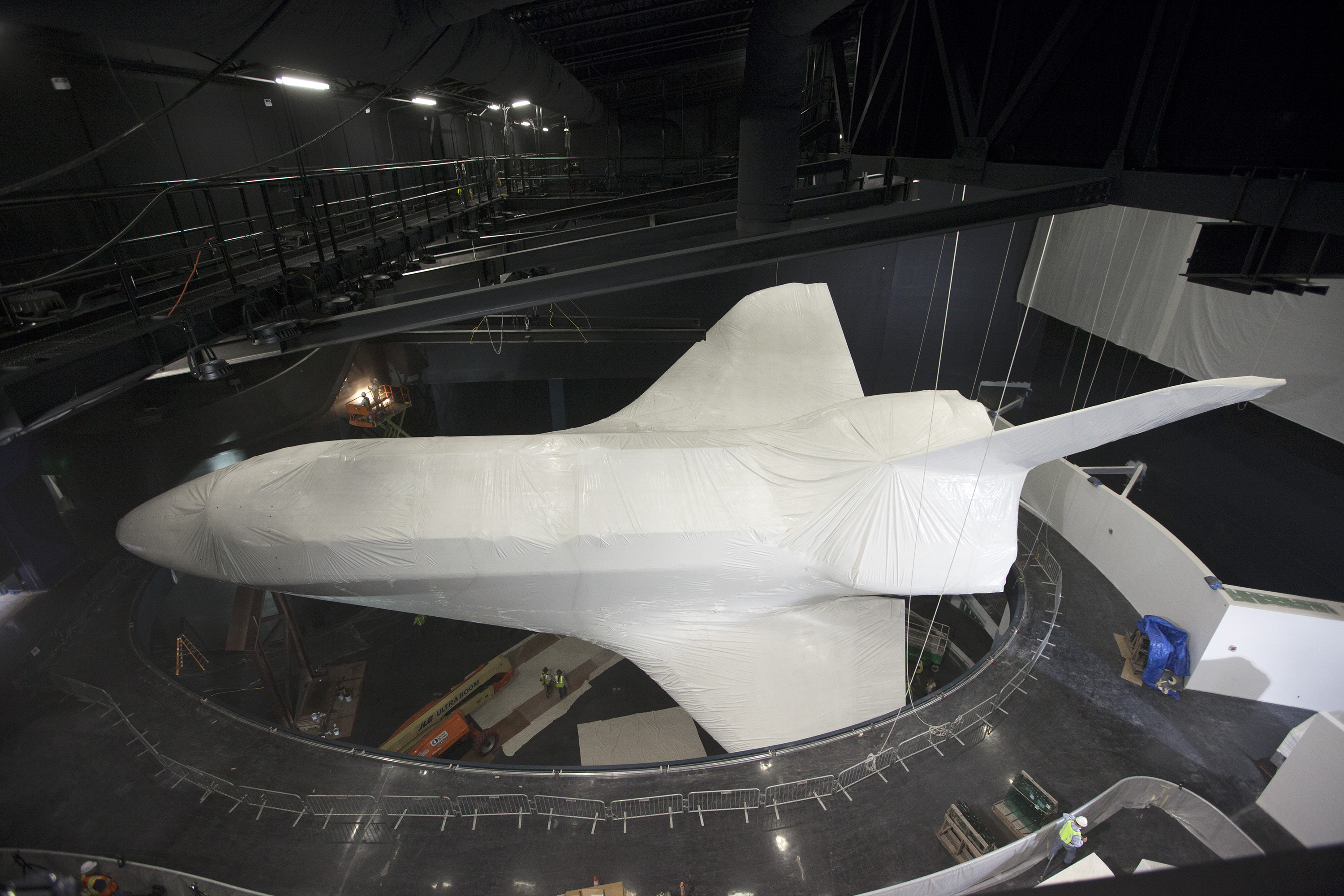 CAPE CANAVERAL, Fla. -- At the Kennedy Space Center Visitor Complex in Florida, construction crews prepare to remove 16,000 square feet of plastic shrink-wrap from the space shuttle Atlantis. The spacecraft was enclosed in the plastic shrink-wrap since November of last year to protect the artifact from dust and debris during construction of the 90,000-square-foot facility. Last November, the space shuttle Atlantis made its historic final journey to its new home, traveling 10 miles from the Kennedy Space Center's Vehicle Assembly Building to the spaceport's visitor complex. The new $100 million 'Space Shuttle Atlantis' facility will include interactive exhibits that tell the story of the 30-year Space Shuttle Program and highlights the future of space exploration. The 'Space Shuttle Atlantis' exhibit scheduled to open June 29, 2013.Photo credit: NASA_Kim Shiflett