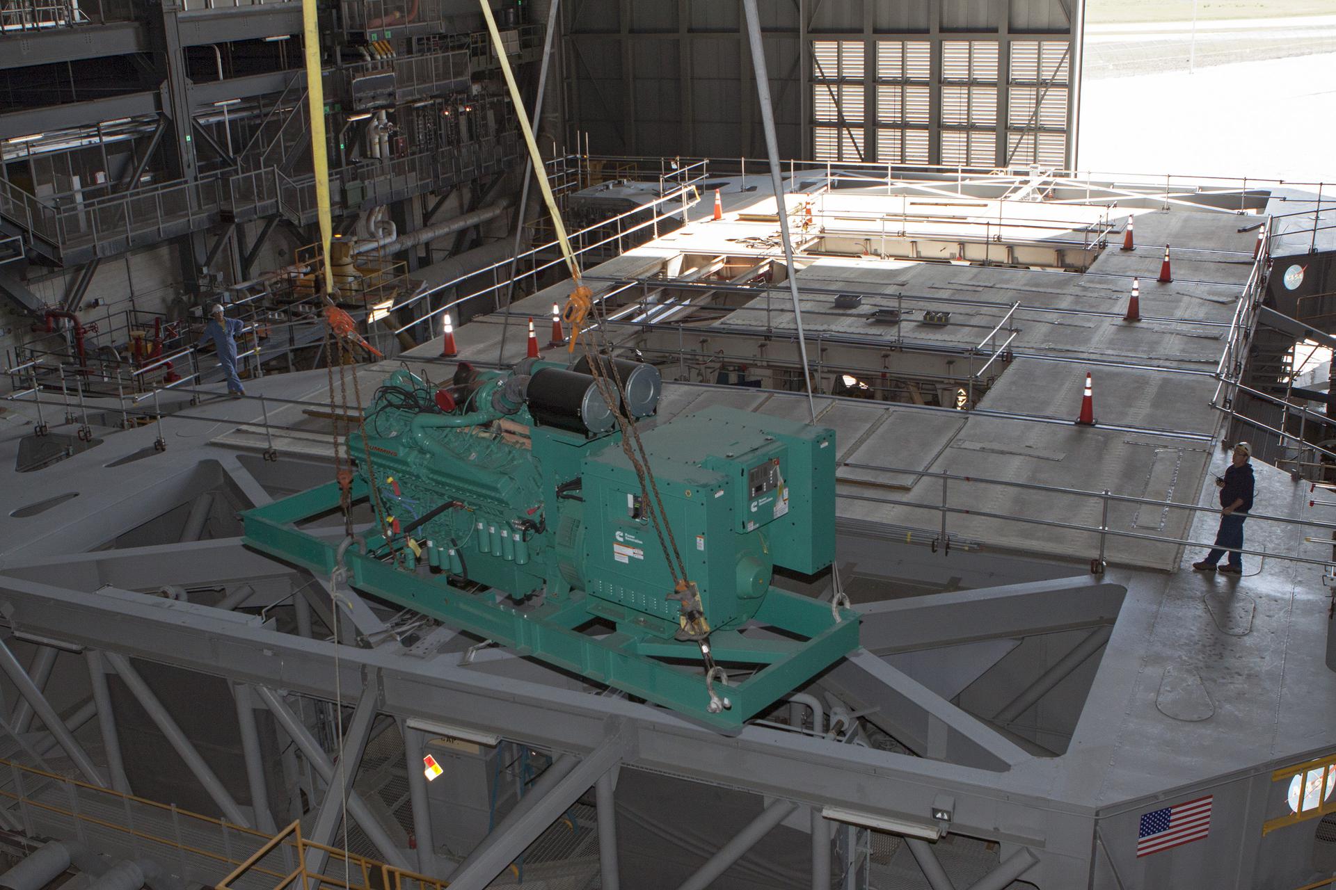 CAPE CANAVERAL, Fla. – Inside the Vehicle Assembly Building at NASA’s Kennedy Space Center in Florida, technicians monitor the progress as a large crane begins to lift a new Cummins engine and generator for installation inside crawler-transporter 1 CT-1. The Apollo era diesel engines were removed so that the new engine can be installed. Work continues in high bay 3 to upgrade CT-1 as part of its general maintenance and could be available to carry commercial launch vehicles to the launch pad. The crawler-transporters were used to carry the mobile launcher platform and space shuttle to Launch Complex 39 for space shuttle launches for 30 years. Photo credit: NASA_Kim Shiflett
