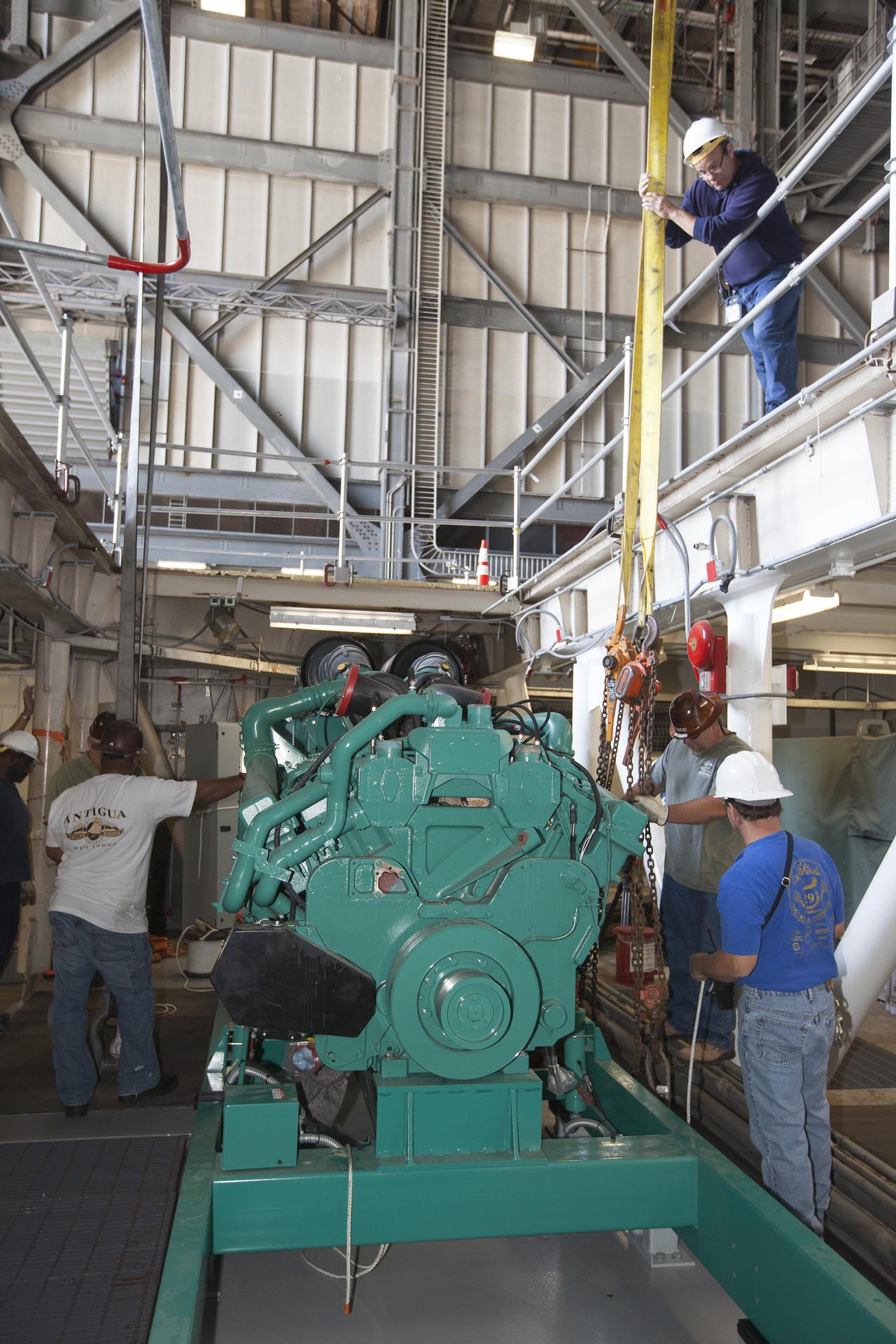 CAPE CANAVERAL, Fla. – Inside the Vehicle Assembly Building at NASA’s Kennedy Space Center in Florida, technicians begin the work to secure a new Cummins engine and generator inside crawler-transporter 1 CT-1. The Apollo era diesel engines were removed so that the new engine can be installed. Work continues in high bay 3 to upgrade CT-1 as part of its general maintenance and could be available to carry commercial launch vehicles to the launch pad. The crawler-transporters were used to carry the mobile launcher platform and space shuttle to Launch Complex 39 for space shuttle launches for 30 years. Photo credit: NASA_Kim Shiflett
