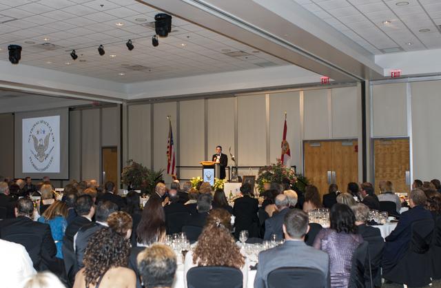 CAPE CANAVERAL, Fla. – At NASA’s Kennedy Space Center Visitor Complex in Florida, center director Bob Cabana speaks after being presented the prestigious Dr. Kurt H. Debus Award. A former U.S. Marine Corps aviator and NASA astronaut, Cabana was honored at the gala Debus Award Dinner. Named for the spaceport’s first director, the Debus Award was created to recognize significant achievements and contributions made in Florida to American aerospace efforts. The Debus Award was created by the space club's Florida committee to recognize significant achievements and contributions made in Florida to American aerospace efforts. Photo credit: NASA_Jim Grossmann