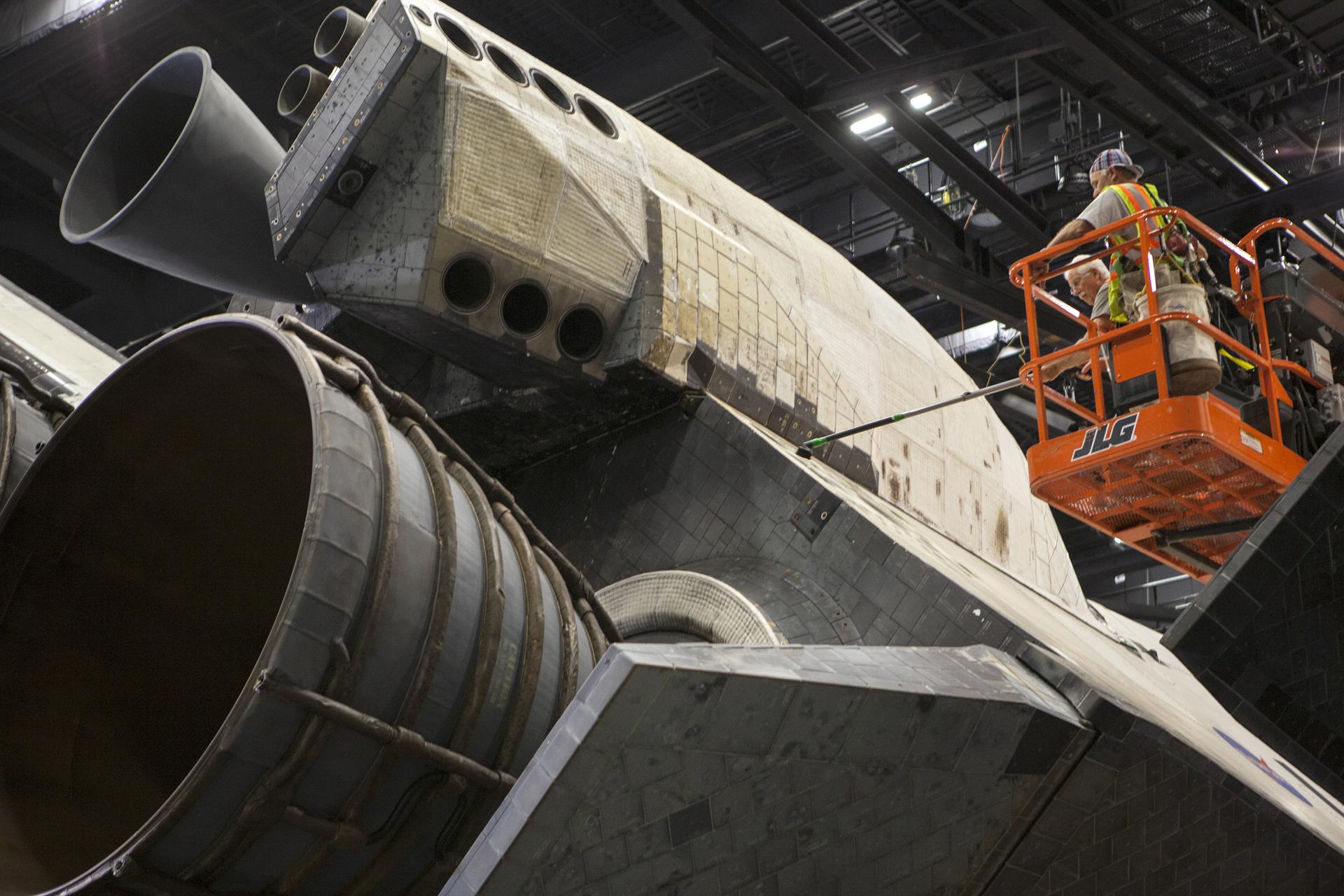 CAPE CANAVERAL, Fla. – Construction crews clean space shuttle Atlantis following the removal of 16,000 square feet of plastic shrink-wrap that enclosed the spacecraft since November of last year to protect the artifact from dust and debris during construction of the 90,000-square-foot facility. The new $100 million 'Space Shuttle Atlantis' facility will include interactive exhibits that tell the story of the 30-year Space Shuttle Program and highlights the future of space exploration. The 'Space Shuttle Atlantis' exhibit scheduled to open June 29, 2013. Photo credit: NASA_ Dmitri Gerondidakis
