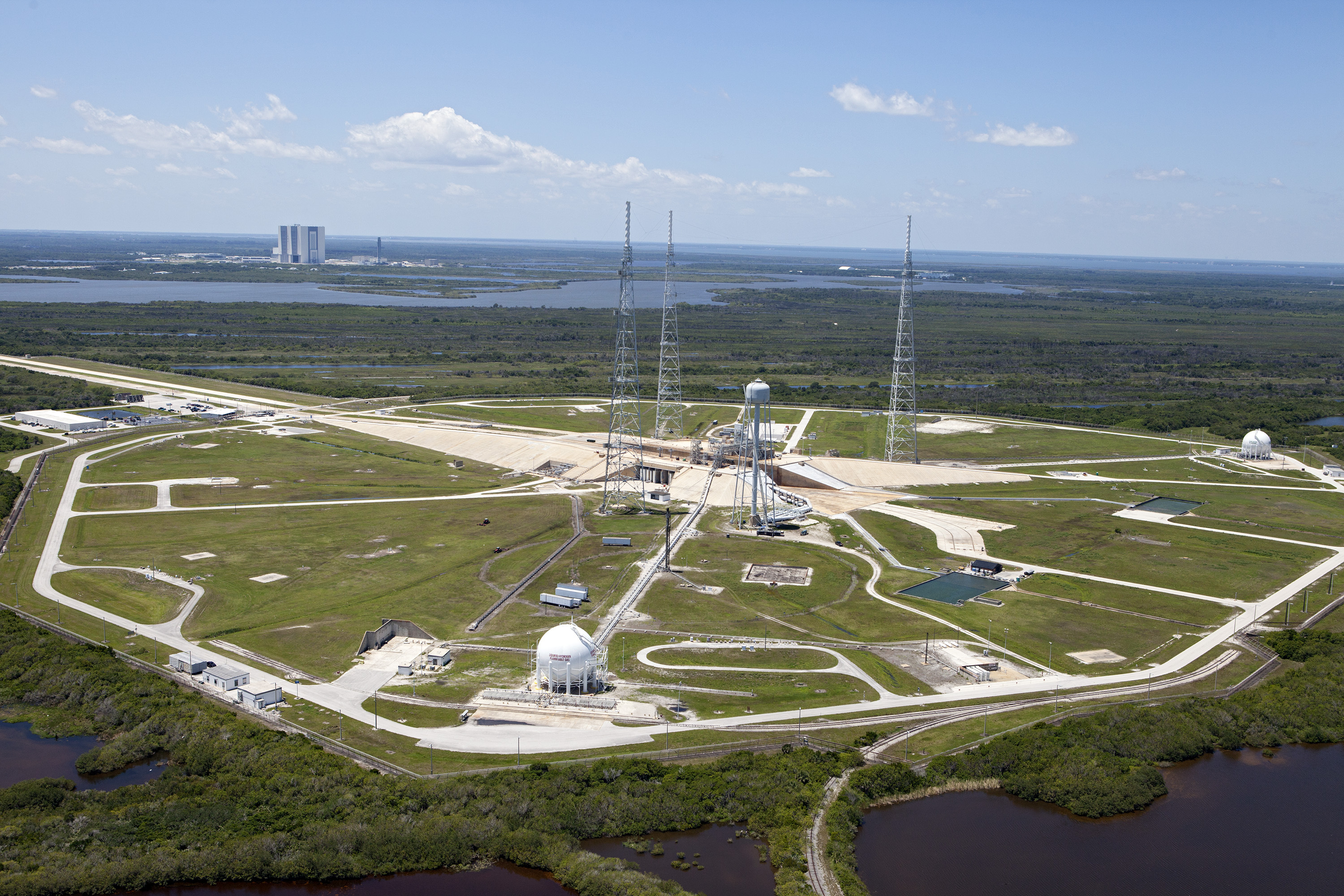 CAPE CANAVERAL, Fla. – An aerial view shows Launch Pad 39B at NASA’s Kennedy Space Center in Florida. A new elevator has been constructed on the surface of the pad and the crawlerway leading up to the surface is being repaired. Repairs also are being made to the crawler track panels and catacomb roof below on either side of the flame trench. Also in view are the water tower and the three tall lightning towers that surround the pad. To the left, in the background is the Vehicle Assembly Building. Upgrades are underway at Pad B and other facilities in the Launch Complex 39 area. The Ground Systems Development and Operations, or GSDO, Program office at Kennedy is leading the center’s transformation from a historically government-only launch complex to a spaceport that can safely handle a variety of rockets and spacecraft, including NASA’s Space Launch System. For more information about GSDO, visit: http:__go.nasa.gov_groundsystems. Photo credit: NASA_Kim Shiflett