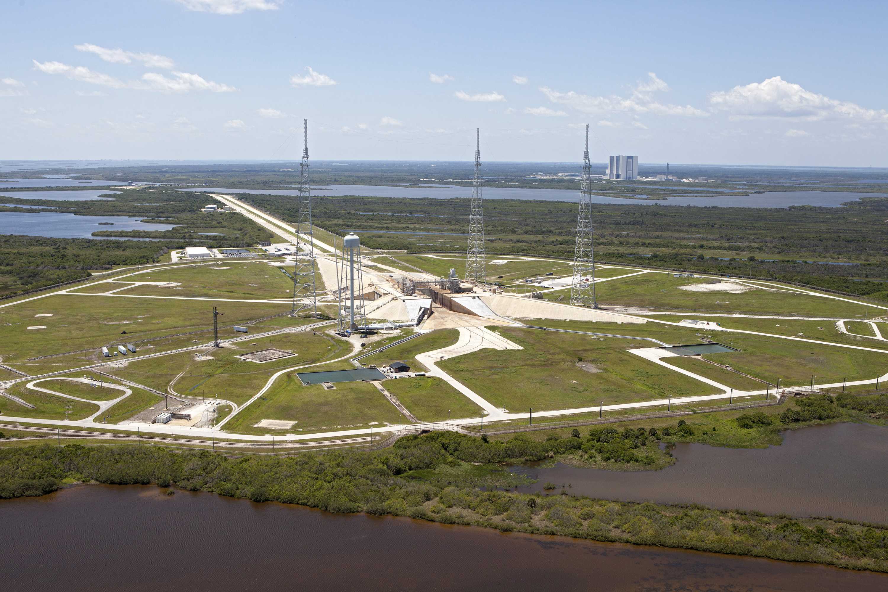 CAPE CANAVERAL, Fla. – An aerial view shows construction progress at Launch Pad 39B at NASA’s Kennedy Space Center in Florida. A new elevator has been constructed on the surface of the pad and the crawlerway leading up to the surface is being repaired. Repairs also are being made to the crawler track panels and catacomb roof below on either side of the flame trench. Also in view are the water tower and the three tall lightning towers that surround the pad. To the right, in the background is the Vehicle Assembly Building. Upgrades are underway at Pad B and other facilities in the Launch Complex 39 area. The Ground Systems Development and Operations, or GSDO, Program office at Kennedy is leading the center’s transformation from a historically government-only launch complex to a spaceport that can safely handle a variety of rockets and spacecraft, including NASA’s Space Launch System. For more information about GSDO, visit: http:__go.nasa.gov_groundsystems. Photo credit: NASA_Kim Shiflett