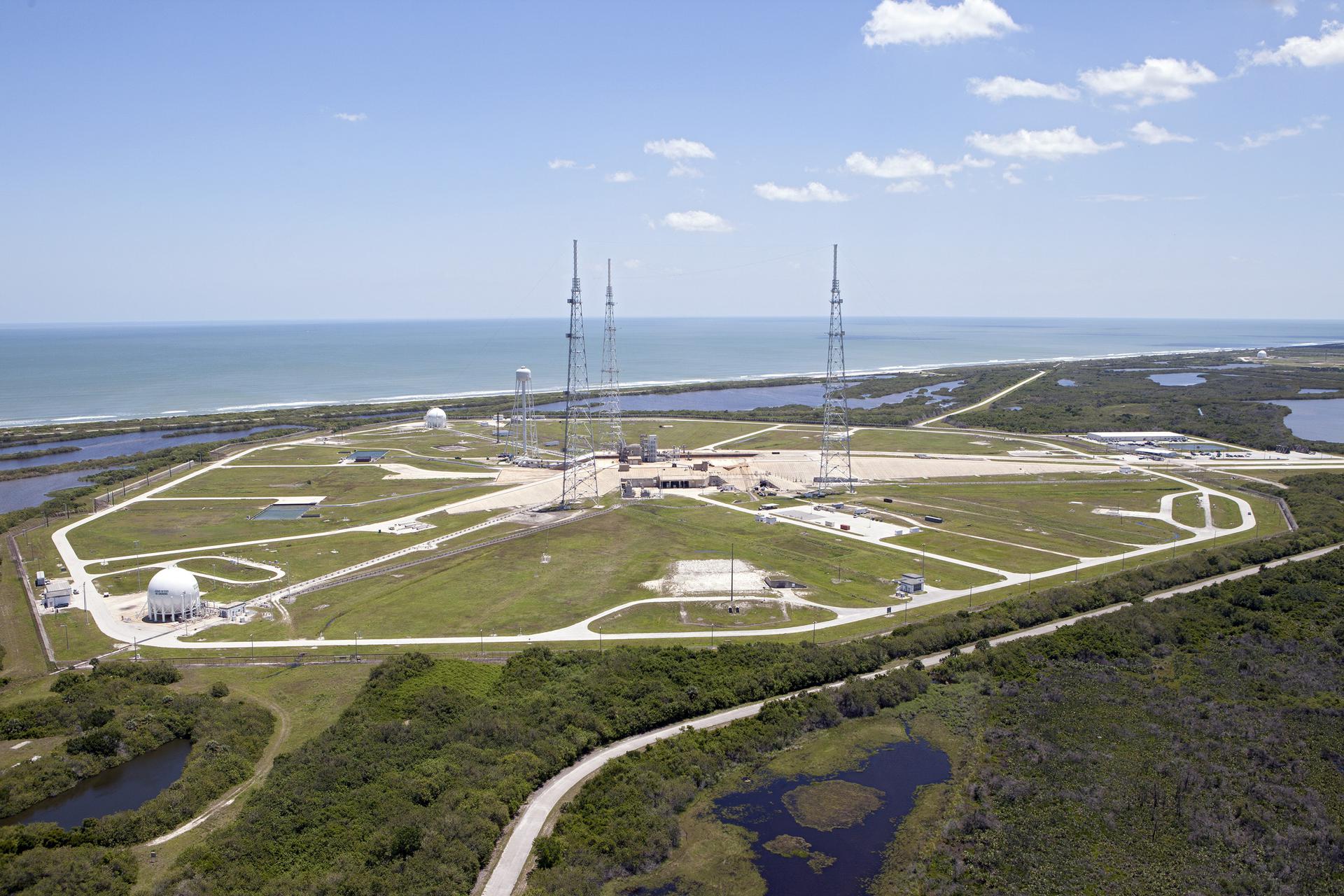CAPE CANAVERAL, Fla. – An aerial view, from the west looking toward the east, shows the entire Launch Pad 39B area at NASA’s Kennedy Space Center in Florida. A new elevator has been constructed on the surface of the pad and the crawlerway leading up to the surface is being repaired. Repairs also are being made to the crawler track panels and catacomb roof below on either side of the flame trench. Also in view are the water tower and the three tall lightning towers that surround the pad. To the east is the Atlantic Ocean. Upgrades are underway at Pad B and other facilities in the Launch Complex 39 area. The Ground Systems Development and Operations, or GSDO, Program office at Kennedy is leading the center’s transformation from a historically government-only launch complex to a spaceport that can safely handle a variety of rockets and spacecraft, including NASA’s Space Launch System. For more information about GSDO, visit: http:__go.nasa.gov_groundsystems. Photo credit: NASA_Kim Shiflett