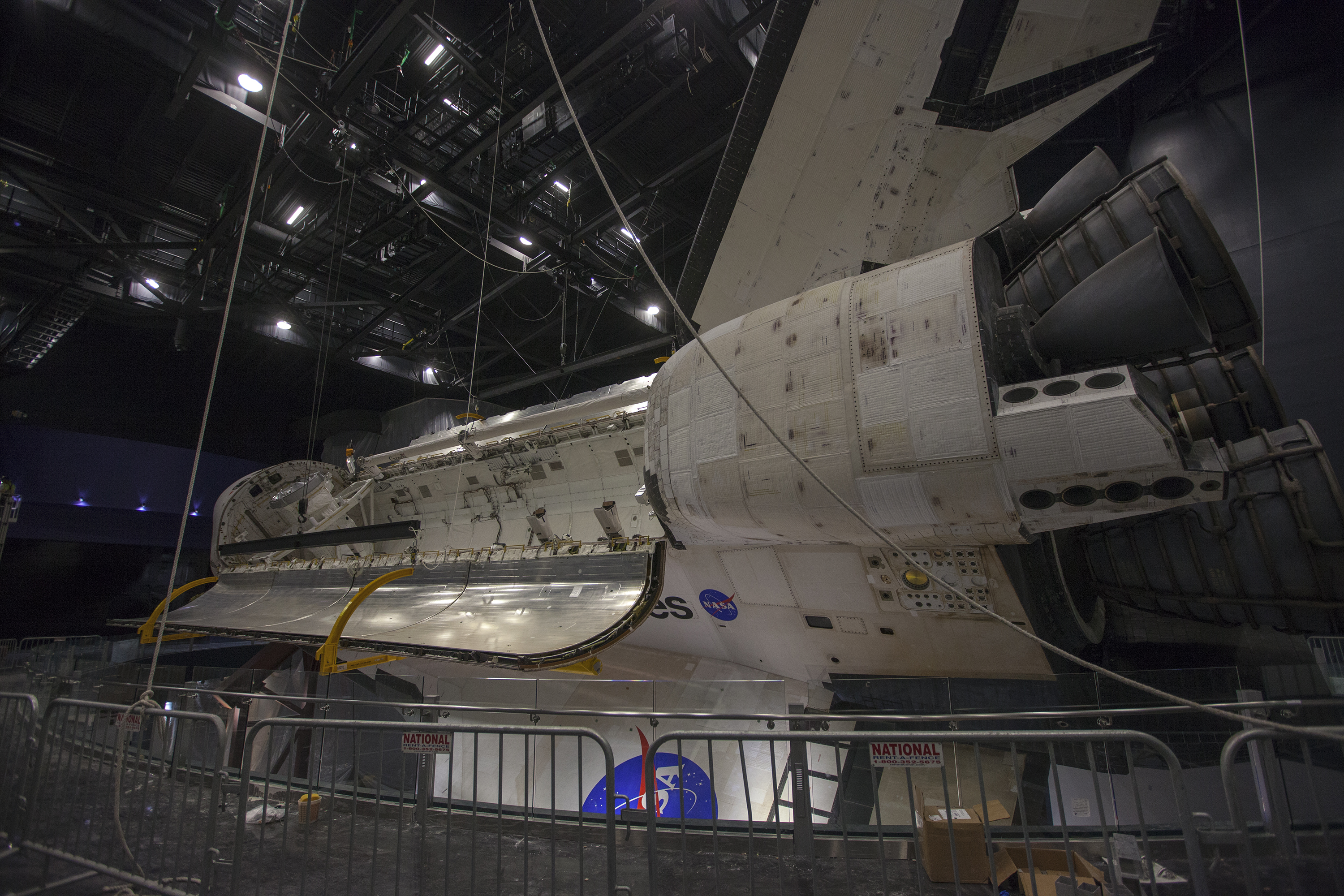 CAPE CANAVERAL, Fla. – At the Kennedy Space Center Visitor Complex in Florida, a view from a different angle shows space shuttle Atlantis’ with its payload bay doors opened. In view also are a portion of the shuttle’s tail mast and three replica shuttle main engines. Atlantis is being prepared for display in the “Space Shuttle Atlantis” exhibit, a 90,000-square-foot facility, scheduled to open June 29, 2013. The new $100 million facility will include interactive exhibits that tell the story of the 30-year Space Shuttle Program and highlight the future of space exploration. Visitors to the exhibit will get an up close look at Atlantis with its payload bay doors open, similar to how it looked in space. Photo credit: NASA_Kim Shiflett