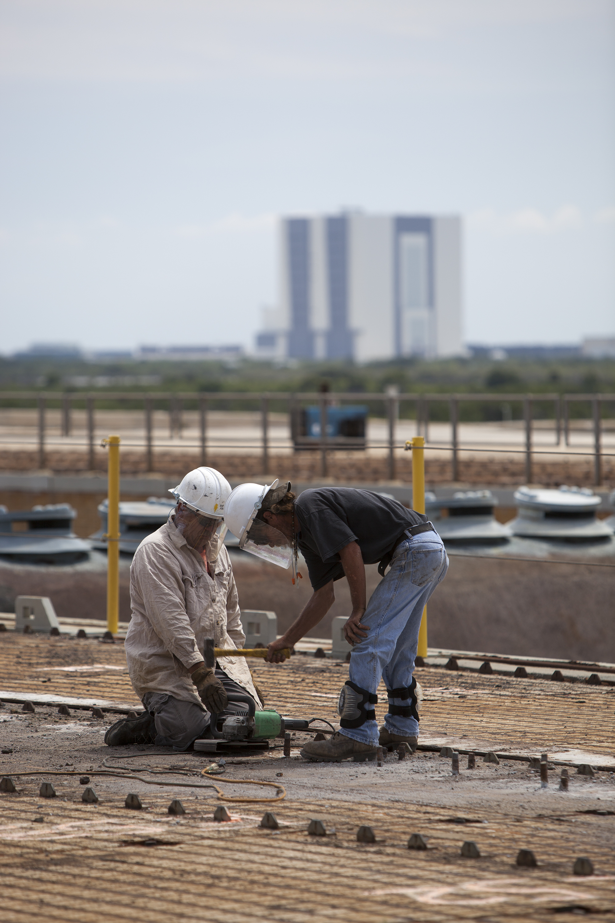 CAPE CANAVERAL, Fla. – At Launch Pad 39B at NASA’s Kennedy Space Center in Florida, construction workers prepare a crawler track panel on the pad’s surface for removal. The concrete surface beneath the panels and the catacomb roof below will be inspected for water damage and repaired. There are 176 panels, each weighing about 30,000 pounds that will be removed. Launch Pad 39B is being refurbished to support NASA’s Space Launch System and other launch vehicles. The Ground Systems Development and Operations, or GSDO, Program office at Kennedy is leading the center’s transformation to safely handle a variety of rockets and spacecraft. For more information about GSDO, visit: http:__go.nasa.gov_groundsystems. Photo credit: NASA_Dimitri Gerondidakis