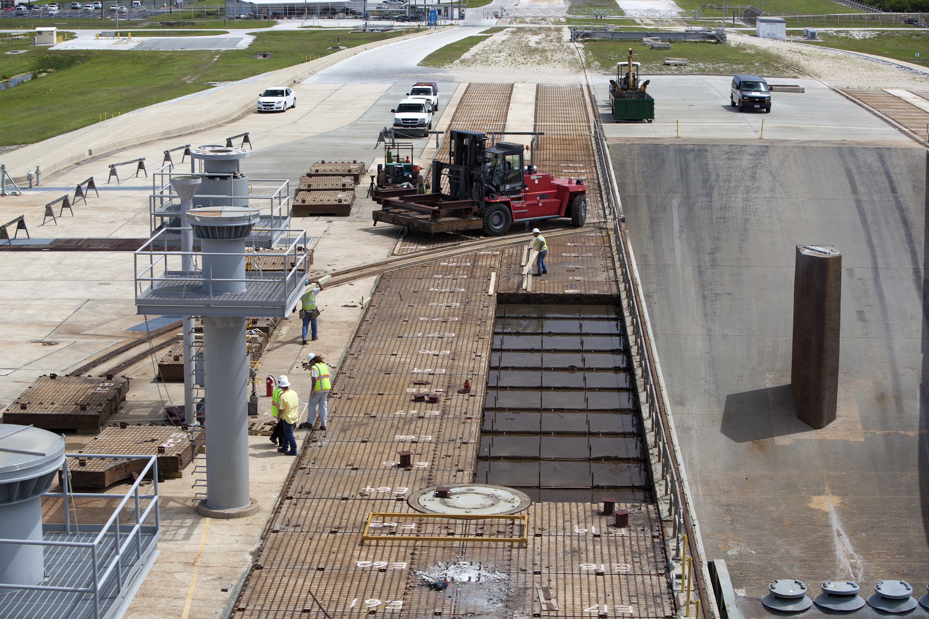 CAPE CANAVERAL, Fla. – At Launch Pad 39B at NASA’s Kennedy Space Center in Florida, an aerial view shows the progress as construction workers remove crawler track panels from the pad’s surface. The concrete surface beneath the panels and the catacomb roof below will be inspected for water damage and repaired. There are 176 panels, each weighing about 30,000 pounds that will be removed. Launch Pad 39B is being refurbished to support NASA’s Space Launch System and other launch vehicles. The Ground Systems Development and Operations, or GSDO, Program office at Kennedy is leading the center’s transformation to safely handle a variety of rockets and spacecraft. For more information about GSDO, visit: http:__go.nasa.gov_groundsystems. Photo credit: NASA_Dimitri Gerondidakis
