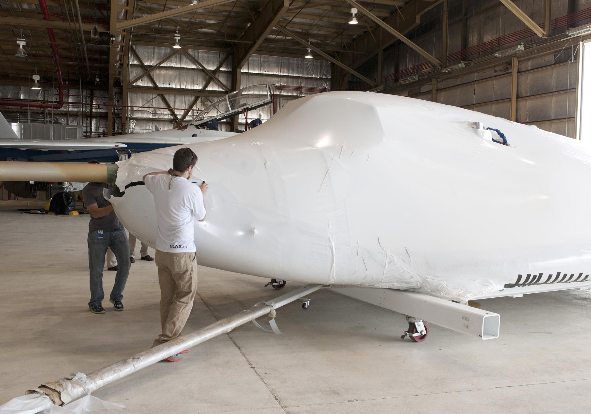 Edwards, Calif. – ED-0144-01 - Plastic wrapping that protected the Sierra Nevada Corporation, or SNC, Dream Chaser flight test vehicle during its transport from Colorado is carefully removed by SNC employee Will Armijo following the craft's arrival at NASA's Dryden Flight Research Center in southern California. The prototype space access vehicle will undergo ground and approach-and-landing flight tests in the coming months as part of NASA's Commercial Crew Program, or CCP, development work. SNC is one of three companies working with CCP during the agency's Commercial Crew Integrated Capability, or CCiCap, initiative, which is intended to lead to the availability of commercial human spaceflight services for government and commercial customers. To learn more about CCP and its industry partners, visit www.nasa.gov_commercialcrew. Image credit: NASA_Tom Tschida